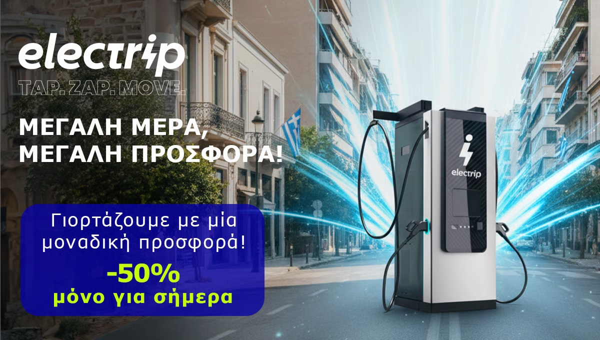 Η Electrip ανακοίνωσε σήμερα έκπτωση 50% στο δίκτυο φόρτισής της για την 25η Μαρτίου. Όσοι, λοιπόν, επισκεφθείτε έναν φορτιστή της εταιρείας αύριο, θα πληρώσετε… τα μισά!