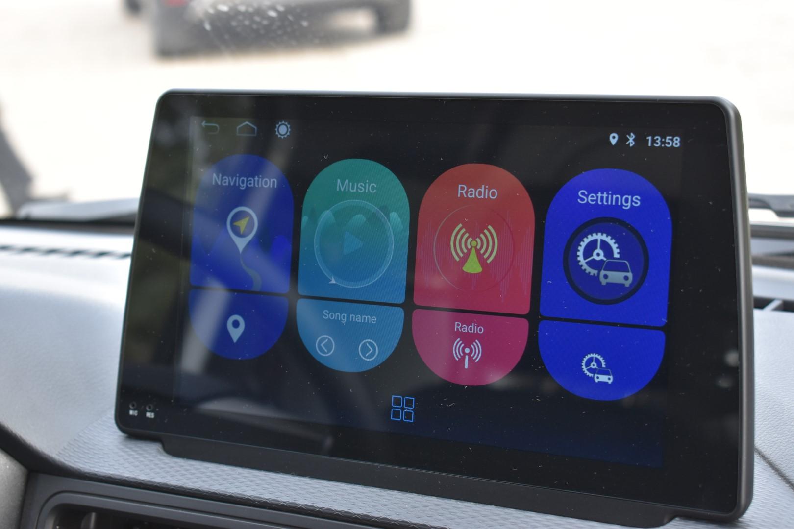 Η κεντρική οθόνη είναι πρακτικά ένα Android tablet 8″ το οποίο παρέχει τις βασικές λειτουργίες και συνδέεται εύκολα με το κινητό μέσω Bluetooth. Θα θέλαμε να έχει λίγο μεγαλύτερη φωτεινότητα αλλά κυρίως, να μην αντανακλά τόσο έντονα το εξωτερικό φως, ειδικά την ημέρα. Με επιλογή της όπισθεν ενεργοποιείται αυτόματα η κάμερα οπισθοπορείας και προβάλλεται η εικόνα της στην κεντρική οθόνη, η ποιότητα είναι μέτρια αλλά σε συνδυασμό με τους αισθητήρες και την ηχητική ειδοποίηση (αλλά και ενδείξεις στο dash για το πόσο κοντά είναι η εκάστοτε πλευρά στο εμπόδιο, δηλαδή πίσω αριστερά και πίσω δεξιά), η κίνηση προς τα πίσω γίνεται αρκετά εύκολη.