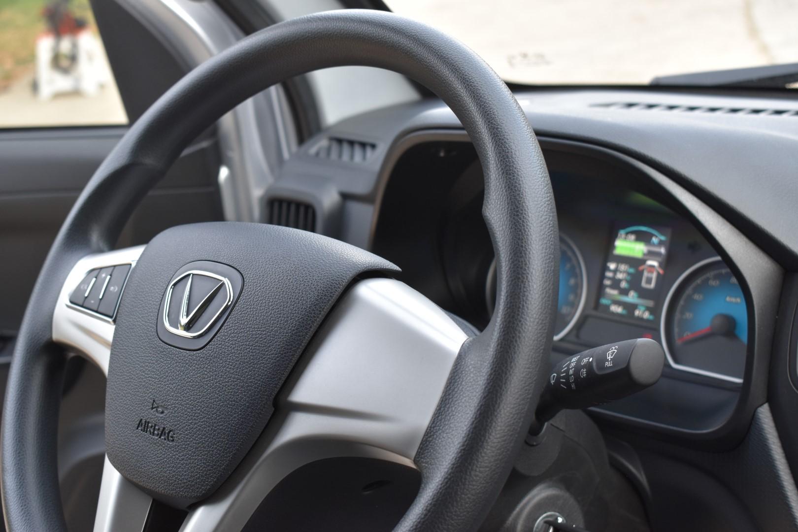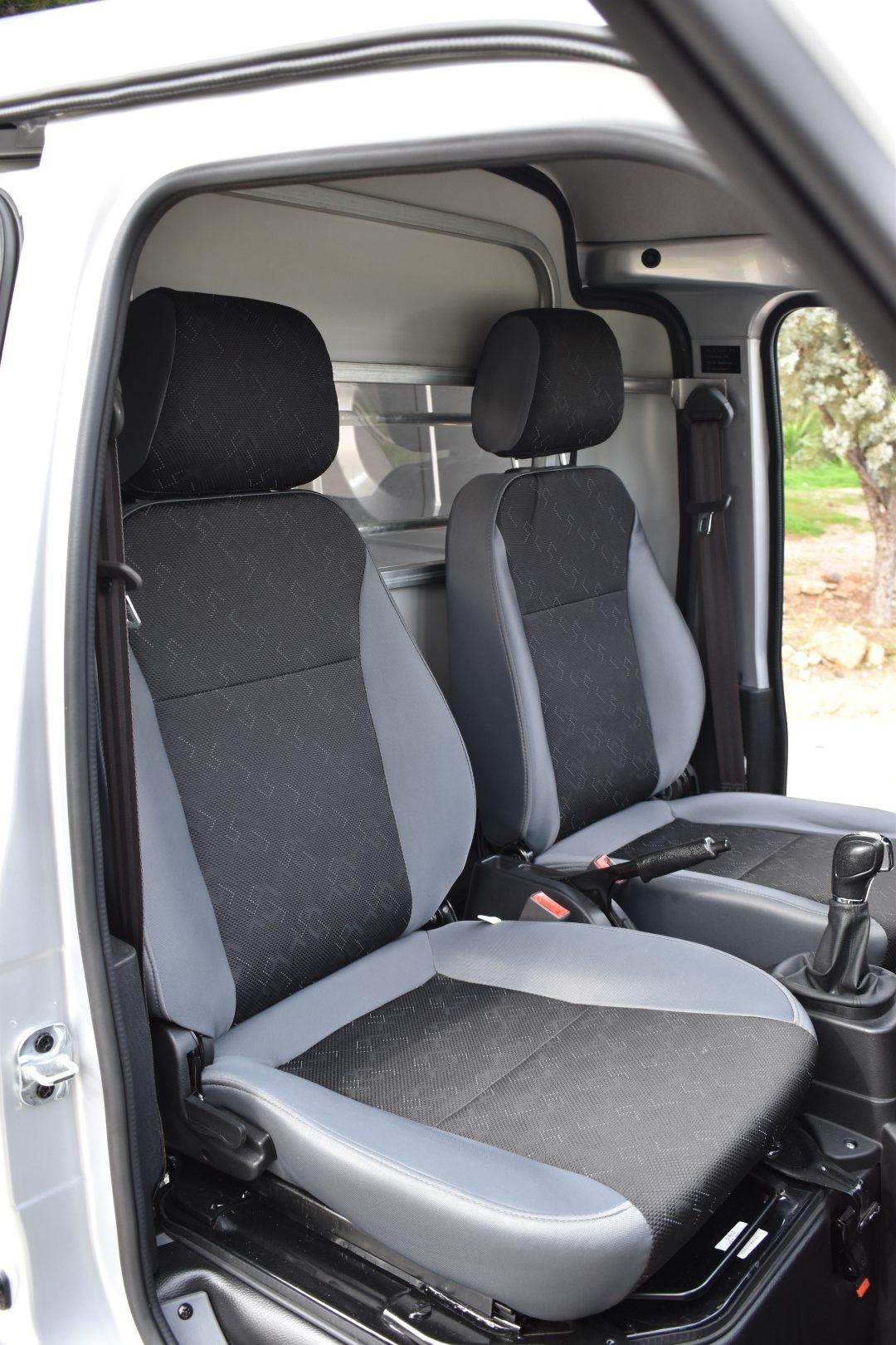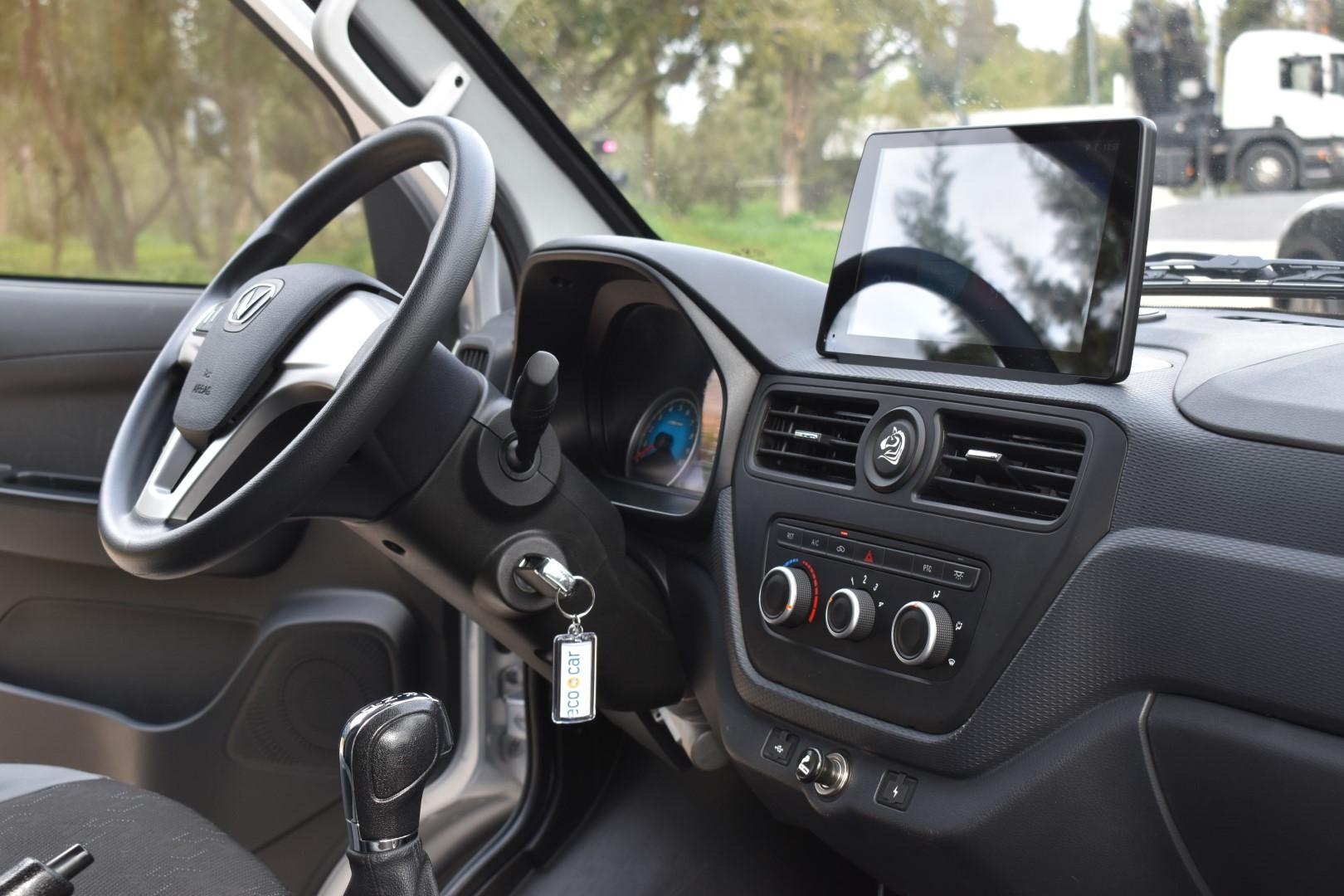 Περνώντας στο εσωτερικό του, το Ecocar Victory Van έχει χώρο για οδηγό και συνοδηγό, με υφασμάτινα καθίσματα και τον βασικό εξοπλισμό να τους υποδέχονται. Έχουμε αερόσακο οδηγού και συνοδηγού, θύρες φόρτισης USB και αναπτήρα (12V), ηλεκτρικά υποβοηθούμενο τριάκτινο τιμόνι με πλήκτρα για ένταση/hands-free), ηλεκτρικά ρυθμιζόμενους καθρέπτες (όχι ηλεκτρικά αναδιπλούμενους, όμως), ηλεκτρικά παράθυρα (χωρίς “Auto” πάνω/κάτω), κεντρικό κλείδωμα με τηλεχειρισμό κ.λπ. Το πάτωμα είναι “flat” αλλά στενεύει μεταξύ οδηγού/συνοδηγού, υπάρχει κεντρική διπλή ποτηροθήκη και τσέπες στις πόρτες, το headroom είναι άπλετο, τα καθίσματα υπερυψωμένα και ρυθμίζονται ελαφρώς ως προς την ανάκλιση, εργονομικά όλα ήταν εκεί που τα θέλαμε και δεν μας προβλημάτισε κάτι. Η ορατότητα είναι ικανοποιητική αν και οι καθρέπτες είναι λίγο στενοί, όμως δεν δυσκολευθήκαμε στις περισσότερες περιπτώσεις.Αυτό που μας έλειψε, ωστόσο, είναι μια θέση για τοποθέτηση του κινητού μας ώστε να είναι ορατό, τόσο για τον οδηγό, όσο και για τον συνοδηγό.