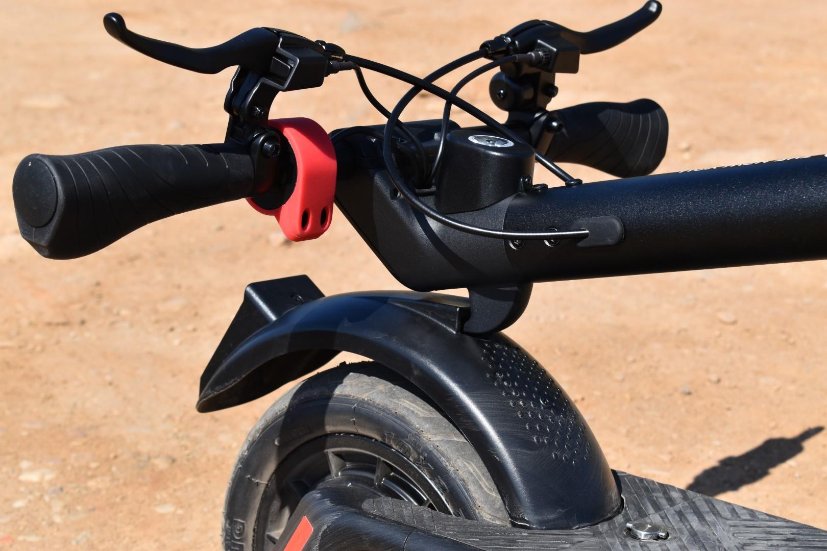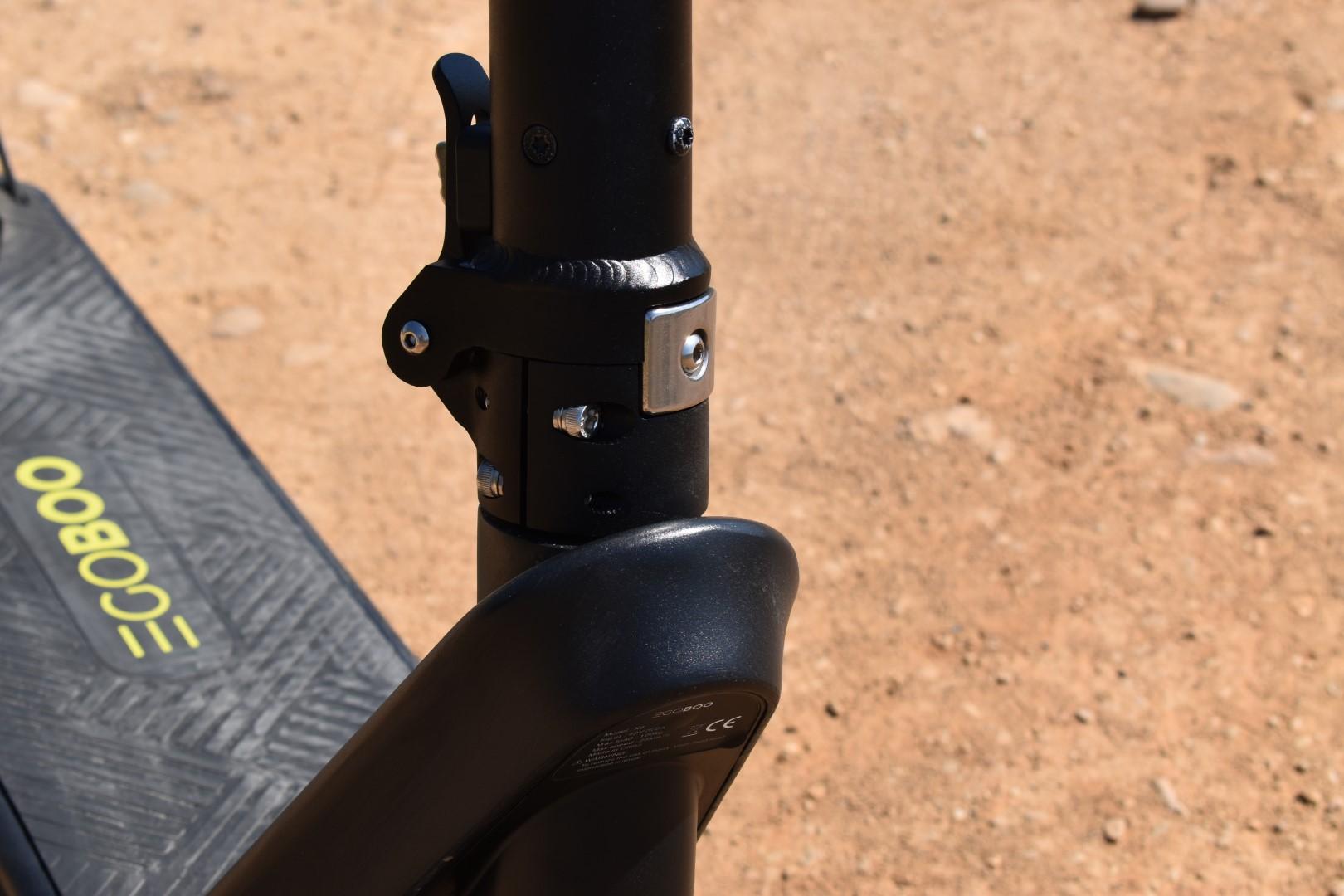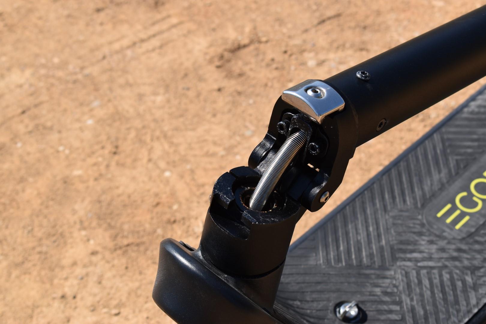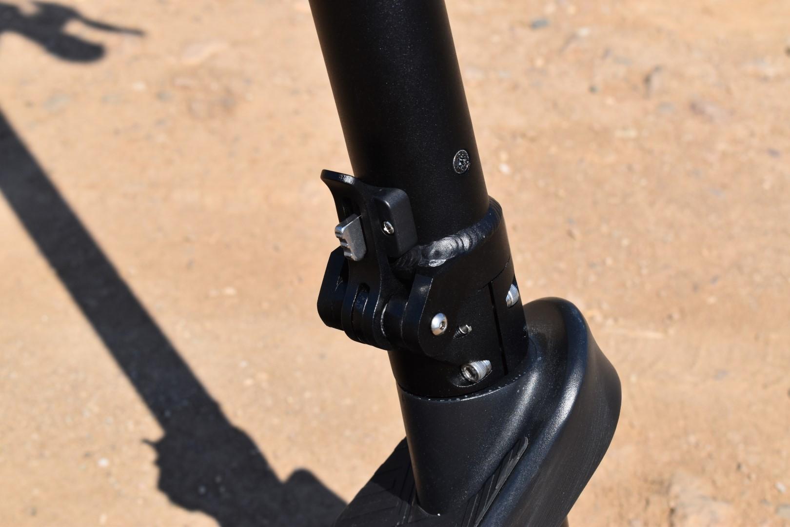 Η κολώνα του τιμονιού έχει αρκετά μεγάλο πάχος και εμπνέει εμπιστοσύνη χάρη σε αυτό, αλλά περισσότερο μας ενδιαφέρει ο μηχανισμός αναδίπλωσης. Είναι κατασκευασμένος από ανθεκτικό μέταλλο (και τη διαφορά με το υπόλοιπο σασί προδίδει το ότι είναι “άβαφος”), ενώ η ασφάλειά του πρέπει να πιεστεί προς τα “μέσα και πάνω” για να απελευθερώσει το latch. Είναι μια κίνηση που μπορεί να γίνει και με το ένα χέρι, μόλις εξοικειωθείτε μαζί της. Ωστόσο, βρήκαμε ένα διαφορετικό σύστημα ασφάλισης της κολώνας στο πίσω μέρος του πατινιού, αρκετά ιδιαίτερο.