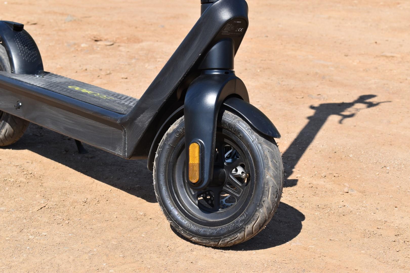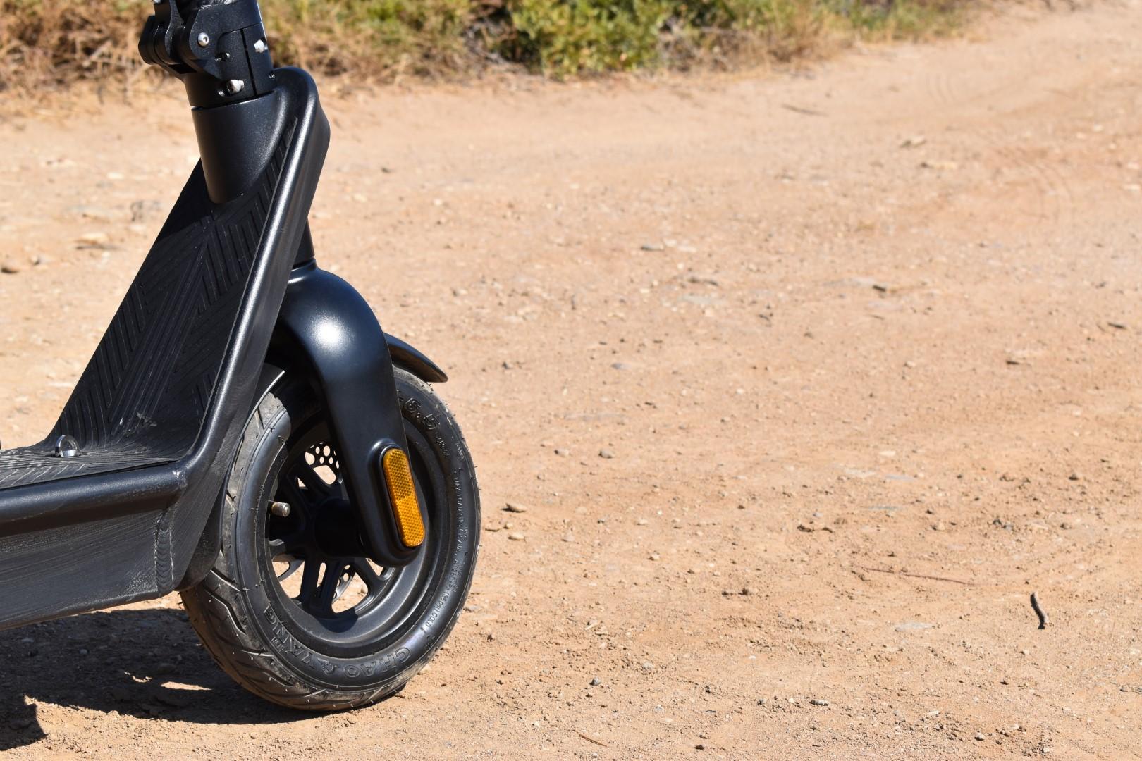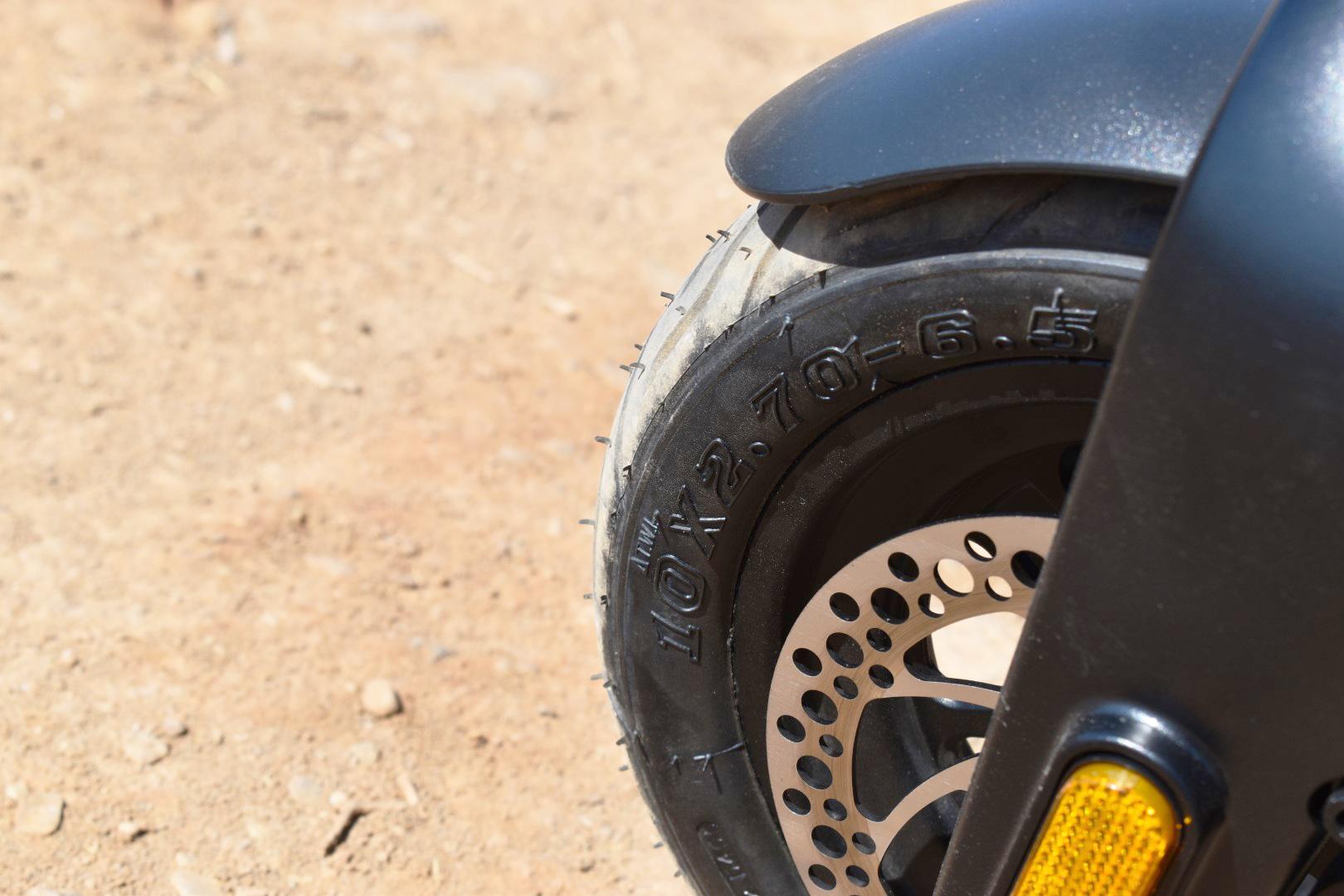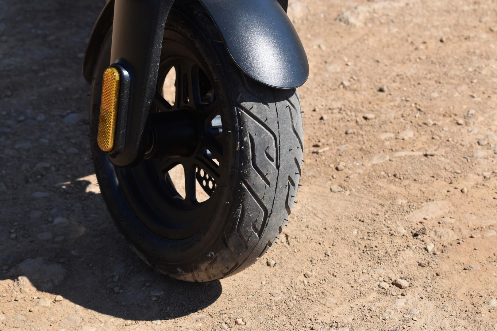 Έχουμε τονίσει πολλάκις οτι η ελάχιστη διάμετρος τροχών για ένα πατίνι πλέον πρέπει να είναι οι 10″, ανεξαρτήτως κατηγορίας. Το Gladiator X9, λοιπόν, διαθέτει τροχούς 10″ με όμορφης σχεδίασης εμπρός ζάντα και tubeless ελαστικά 10×2,7-6,5, αρκετά φαρδιά για την ισχύ του και την κατηγορία του. Αυτό μεταφράζεται σε ευστάθεια στο δρόμο, ειδικά σε κακοτεχνίες του οδοστρώματος όπου ένα λεπτότερο ή μικρότερο σε διάμετρο ελαστικό μπορεί να επηρεάσει τη συμπεριφορά του πατινιού σε μεγάλο βαθμό, οπότε το συγκαταλέγουμε στα πλεονεκτήματα, σαφώς.