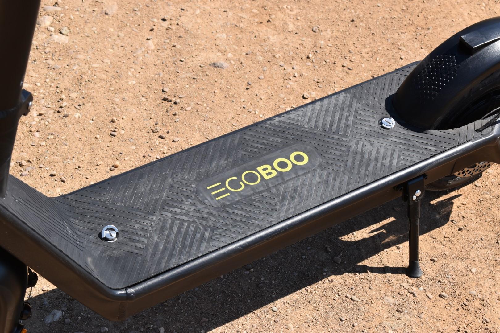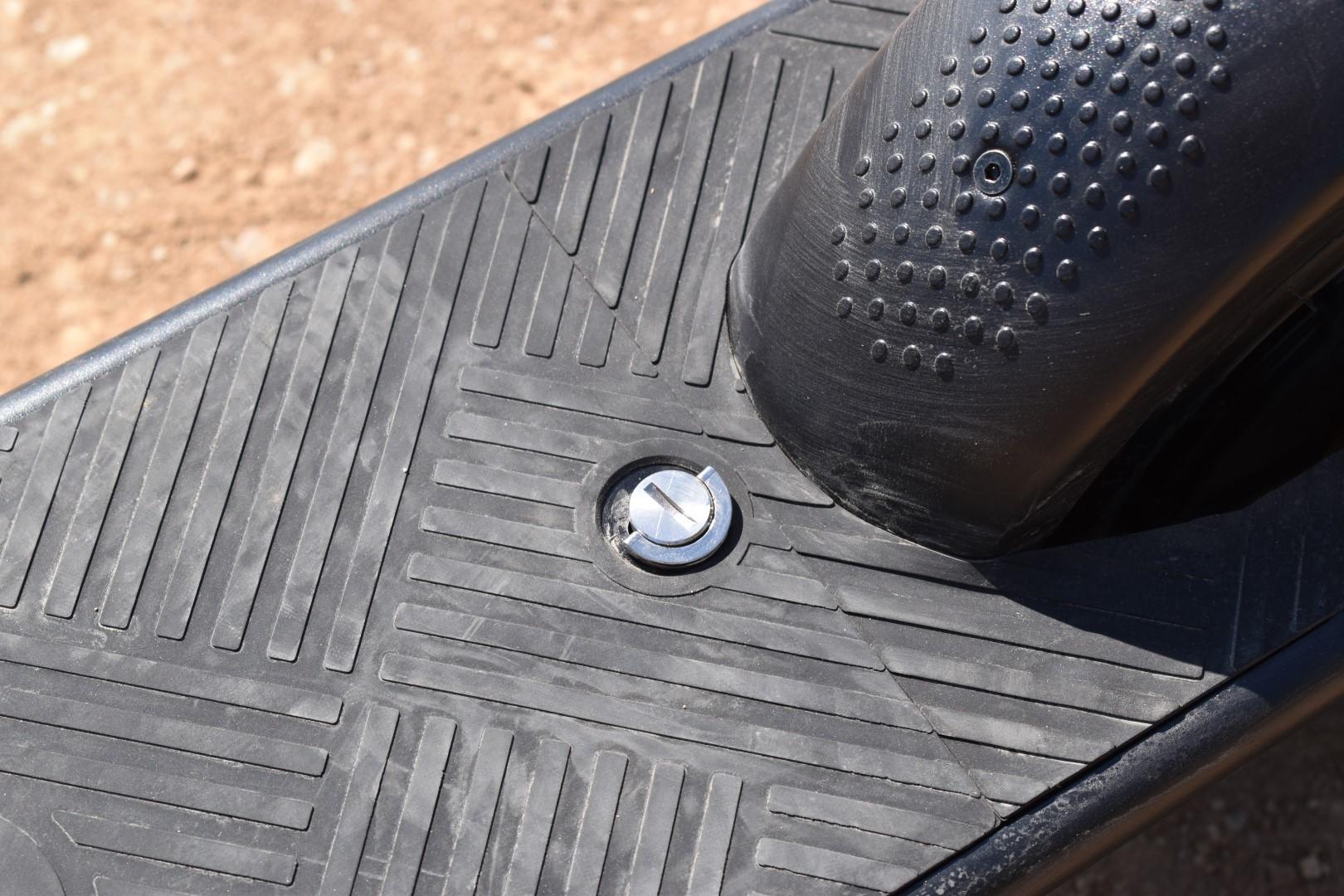 Σε γενικές γραμμές, η μεγάλη σε χωρητικότητα μπαταρία κρύβει εξαιρετικά τις διαστάσεις της μέσα στο deck, χωρίς να αυξάνει τον όγκο του πατινιού, ούτε καν την απόσταση από το έδαφος, η οποία αγγίζει τα 12cm και είναι ικανοποιητική. Πάνω στο deck βρίσκουμε ένα ελαστικό “πάτωμα” που προσφέρει μπόλικο grip και καθαρίζεται εύκολα, ενώ ξεχωρίζουν οι δύο… μυστήριες βίδες, για τις οποίες θα μιλήσουμε στη συνέχεια. Τα χερούλια είναι ανατομικής σχεδίασης και η απόσταση του deck από αυτά είναι περίπου 99cm, κάτι που σημαίνει οτι το πατίνι θα εξυπηρετήσει αναβάτη ύψους έως και 1,90m περίπου, με άνεση.