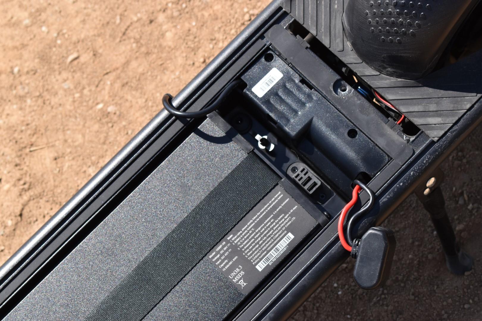 Η διαδικασία αφαίρεσής της, μόλις εξοικειωθείτε μαζί της, είναι ζήτημα 10-20″. Τα βιδάκια είναι εύχρηστα, σφίγγονται/ξεσφίγγονται με το χέρι (αλλά και με ένα κέρμα, αν δυσκολευθείτε), επιτρέποντας την ανασήκωση του “καπακιού”, μαζί με την ελαστική επένδυση του deck. Λίγο πιο “tricky” είναι το βίδωμά τους, μέχρι να βρείτε τη σωστή θέση, αυτό θα το δείτε καλύτερα στο video μας. Η στεγανότητα του χώρου της μπαταρίας είναι ικανοποιητική, αν και δεν θα προτείναμε να αφήσετε το πατίνι εκτεθειμένο στη βροχή για ώρες, χωρίς σοβαρό λόγο. Κλείνουμε με το προφανές, δηλαδή το οτι χωρίς την μπαταρία το πατίνι ζυγίζει περίπου 18 Kg, άρα και είναι ακόμα πιο ελαφρύ, αν αυτό σας απασχολεί.