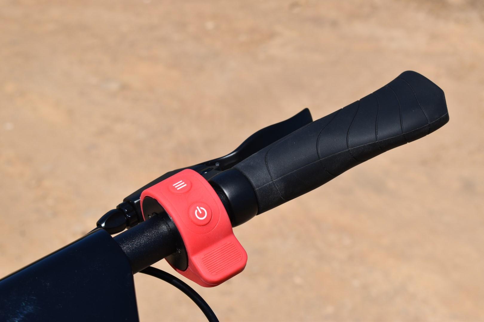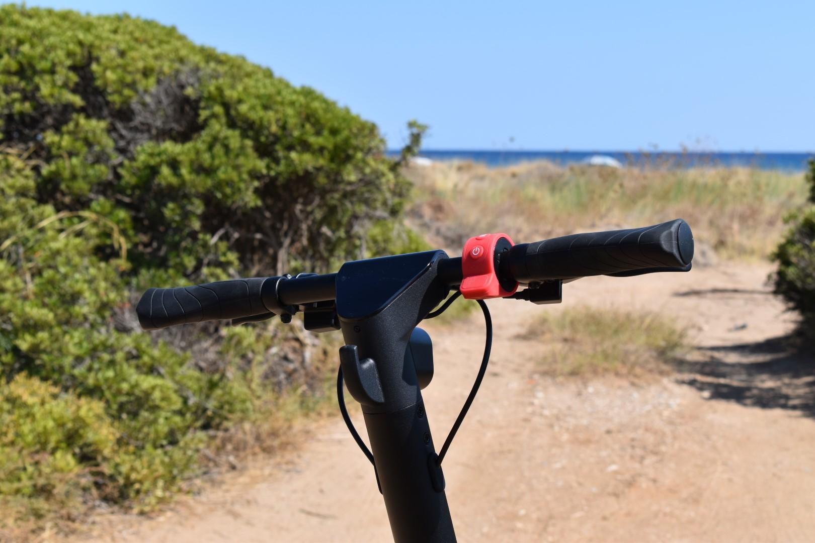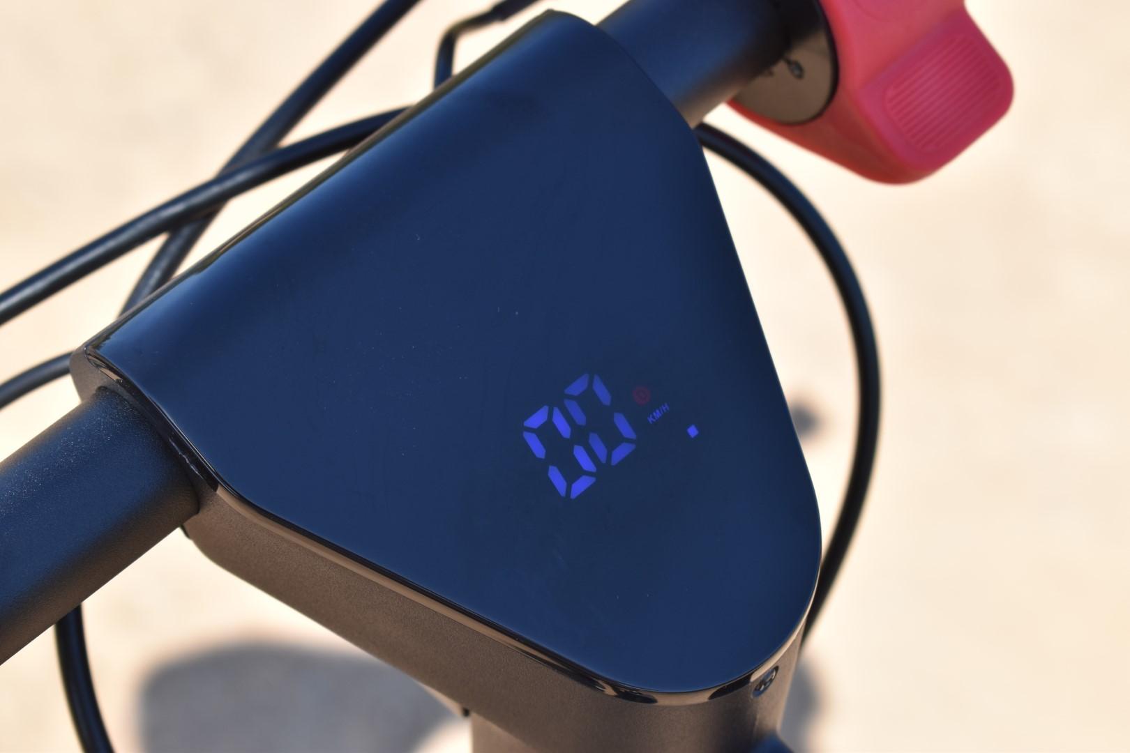 Η οθόνη είναι “φιμέ” LCD, ευανάγνωστη μέρα και νύχτα, προβάλλοντας την ταχύτητα, το mode λειτουργίας και τη στάθμη της μπαταρίας (5 “κουτάκια”), υπό κανονικές συνθήκες. Όσο για τα πλήκτρα, είναι δύο και βρίσκονται πάνω στο thumb throttle, κάτι που επίσης βλέπουμε πρώτη φορά σε πατίνι. Το ένα είναι το power button και το δεύτερο αλλάζει το mode (με ένα πάτημα) και ανάβει/σβήνει τα φώτα (με γρήγορο διπλό πάτημα).