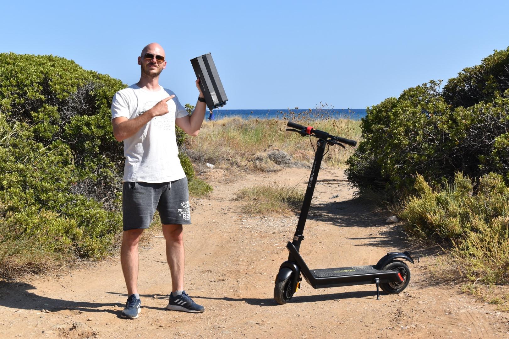 Για το τέλος αφήσαμε το σημαντικότερο χαρακτηριστικό του EGOBOO Gladiator X9, που το ξεχωρίζει και από κάθε ανταγωνιστή του, την αφαιρούμενη μπαταρία! Το σκεπτικό, όπως και στα ηλεκτρικά ποδήλατα, είναι οτι μπορείτε να αφαιρείτε τη μπαταρία και να την έχετε ξεχωριστά από το πατίνι, για διάφορους λόγους. Για φόρτισή της, για αποθήκευσή της, για την ασφάλειά της από κλοπή κ.λπ. Παρ’ότι το μοντέλο δεν είναι ιδιαίτερα βαρύ και είναι σχετικά compact, αν δεν θέλετε/μπορείτε να το μεταφέρετε στον χώρο φόρτισης, μπορείτε απλά να ξεβιδώσετε τις δύο βίδες του deck, να βγάλετε την μπαταρία και να πάρετε αυτήν μαζί σας! Η μπαταρία ζυγίζει 4,2 Kg και πρακτικά μεταφέρεται πανεύκολα.