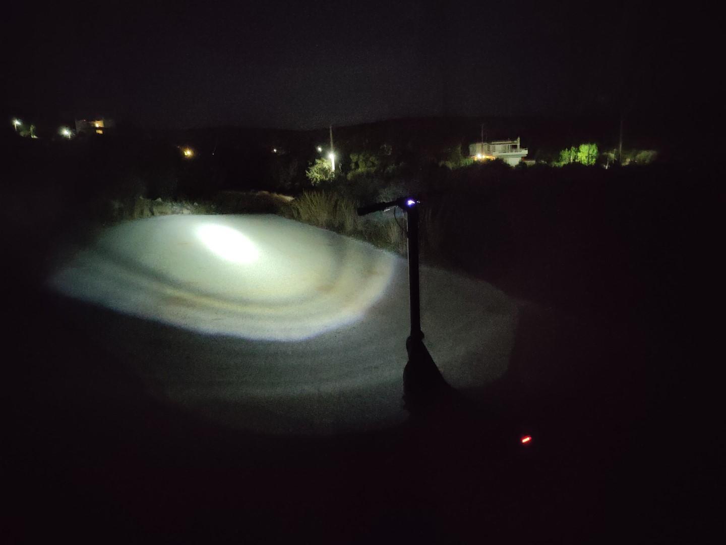 Το εμπρός φως του Gladiator X9 αποτελείται από ένα στρογγυλό, λευκό LED, ψηλά στην κολώνα του τιμονιού. Δημιουργεί μια μεγάλη, οωειδή δέσμη που κεντρικά φωτίζει έντονα, με πιο “απαλό” φωτισμό περιμετρικά. Θα σας καλύψει το βράδυ ακόμα και σε πολύ σκοτεινή διαδρομή, φωτίζοντας 10-15m μπροστά σας και καλύπτοντας σχεδόν όλο το πλάτος ενός τυπικού δρόμου.