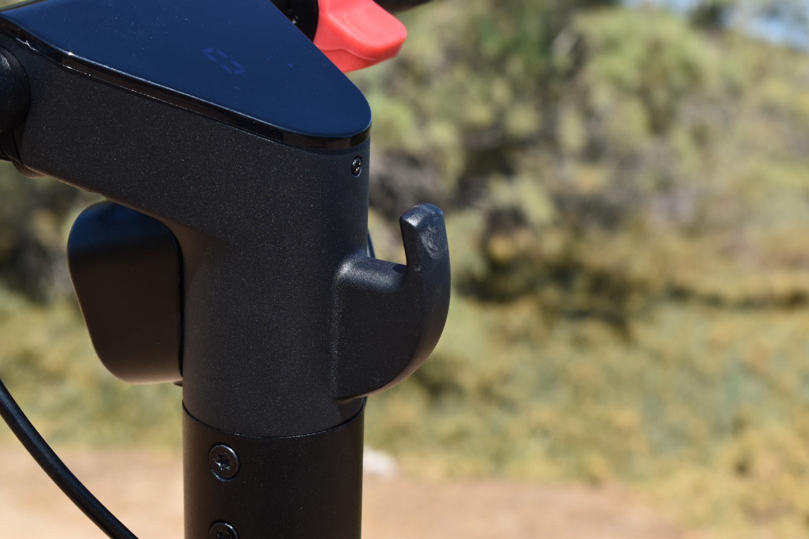 Το πλαστικό γαντζάκι, ψηλά στην κολώνα, δεν είναι βιδωτό αλλά “ενιαίο” μαζί με εκείνο το τμήμα της, άρα πολύ στιβαρό και μπορείτε εκεί να κρεμάσετε άνετα και μια σχετικά βαριά σακούλα (π.χ. 2-3 Kg). Το πίσω φτερό διαθέτει μια οπή ειδικά για το γαντζάκι αυτό και πιέζοντάς το προς τα κάτω, του επιτρέπει να “κουμπώσει” εκεί, ώστε άνετα να σηκώσετε το πατίνι με το ένα χέρι. Με την μέθοδο αυτή η EGOBOO απέφυγε την τοποθέτηση έξτρα μηχανισμού πάνω στο τιμόνι και εκμεταλλεύθηκε έξυπνα το πίσω φτερό, το οποίο είναι μεγάλο, στιβαρό και λειτουργεί και ως ποδόφρενο αλλά και footrest!