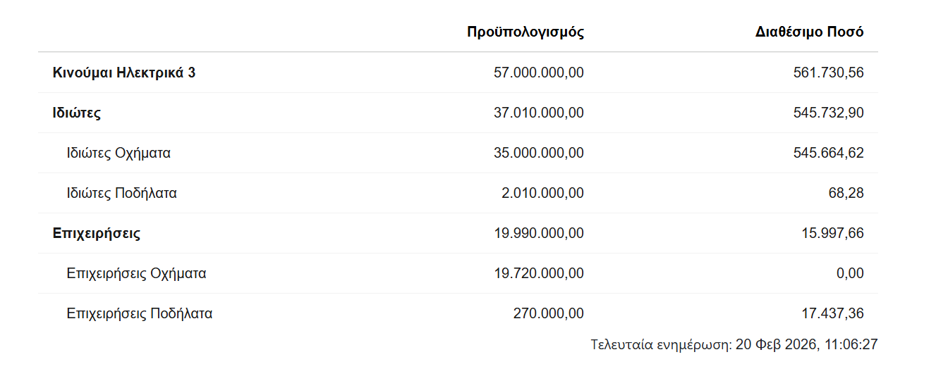 Ωστόσο, οι πληροφορίες της στήλης μας κάνουν λόγο για επερχόμενη “ένεση” χρημάτων στο πρόγραμμα, η οποία θα γίνει τις επόμενες εβδομάδες. Σημαντική λεπτομέρεια είναι οτι τα χρήματα (άγνωστο το ποσό που θα μπει) θα προστεθούν σε δύο κατηγορίες που αυτή τη στιγμή έχουν “στεγνώσει” από πόρους: Την κατηγορία των ηλεκτρικών αυτοκινήτων και μοτοσυκλετών/microcars για επιχειρήσεις (νομικά πρόσωπα) και την κατηγορία των ηλεκτρικών ποδηλάτων για φυσικά πρόσωπα.
