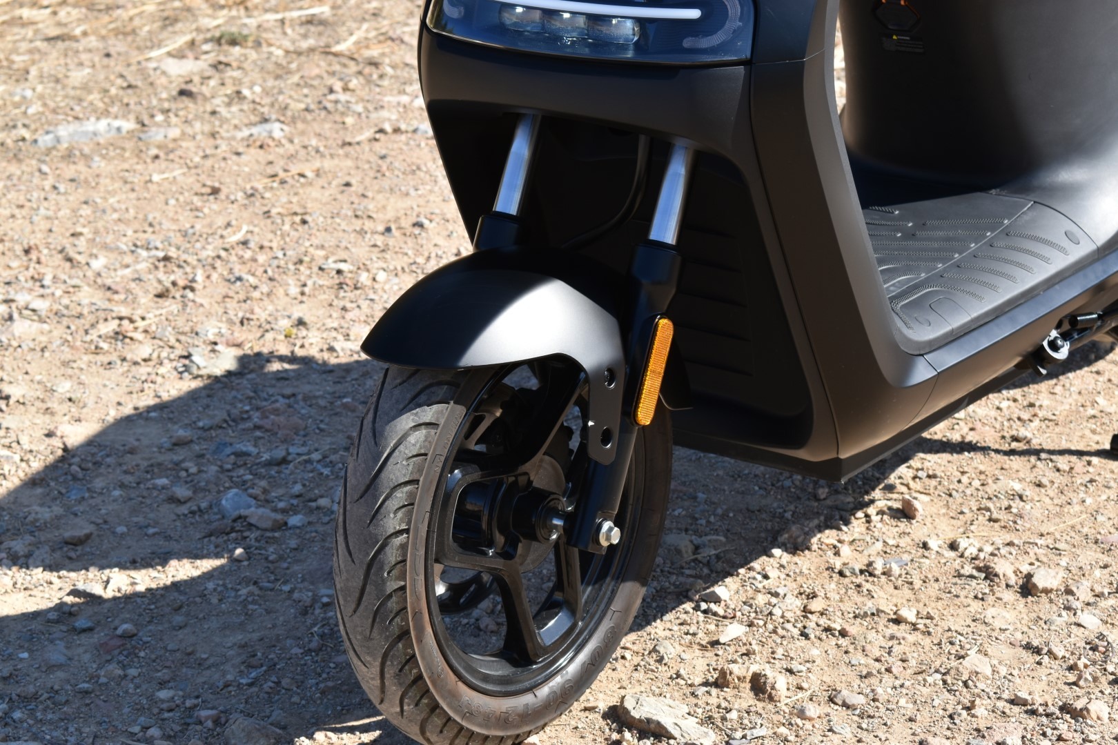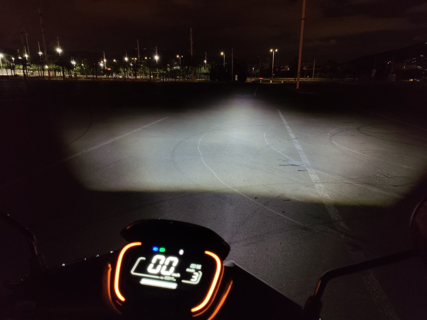 Όσον αφορά το φωτισμό, μπροστά έχουμε ένα διαμήκες φωτιστικό σώμα με 6 projector LEDs. Τα διατρέχει, οριζοντίως, με LED μπάρα που λειτουργεί ως DRL. Αριστερά και δεξιά υπάρχουν και τα κίτρινα LED φλας, με τη μορφή αγκύλης. Συνολικά το εμπρός φως, παρ΄ότι δεν είναι πάνω στο τιμόνι (και άρα δεν “κοιτάζει” όπου το τιμόνι), έχει μεγάλο εύρος φωτισμού και είναι αρκετά ισχυρό. Έτσι, θα σας καλύψει ακόμα και σε σκοτεινούς δρόμους, εντός και εκτός πόλης, με άνεση. Τα 3 projectors κάτω από το DRL είναι always-on, για μέρα και νύχτα. Τα 3 πάνω από το DRL είναι η μεγάλη σκάλα και στοχεύουν κεντρικά και μακριά, επίσης κρίνονται αρκετά καλά. Στο πίσω μέρος, το διακριτικό, κόκκινο φωτιστικό σώμα έχει ωραίο οπτικό αποτέλεσμα και περιλαμβάνει τα κίτρινα LEDs αριστερά και δεξιά του, για τα φλας. Σε γενικές γραμμές, μείναμε πολύ ικανοποιημένοι και από τα φώτα του E110SE.