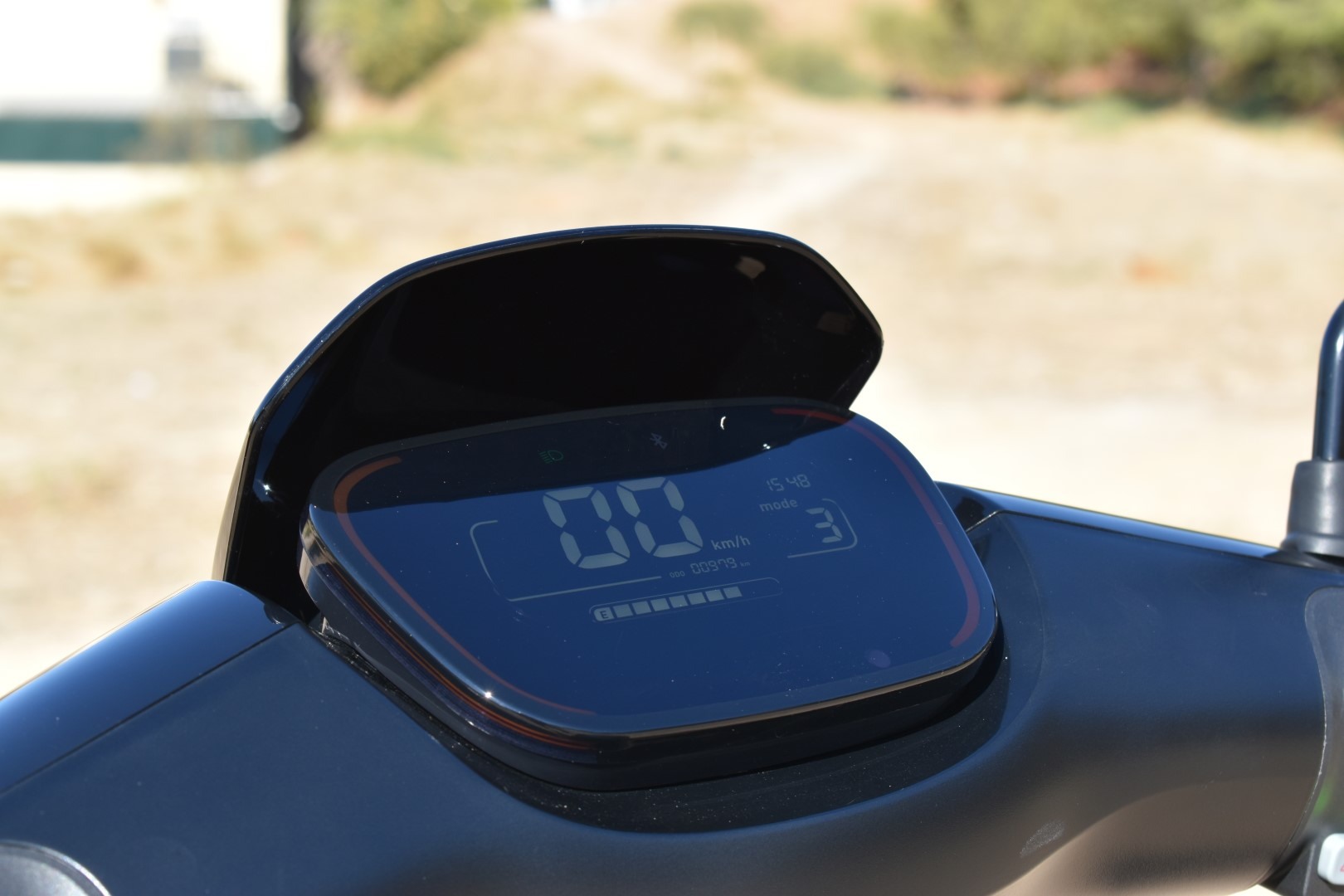Το κομμάτι αυτό έχει πολύ… ψωμί, καθώς το Segway E110SE είναι ένα αρκετά “smart” σκούτερ. Η LCD οθόνη έχει μαύρο φόντο και καλύπτεται από ελαφρώς φιμέ πλαστικό. Οι ενδείξεις είναι λευκού χρώματος και ευτυχώς διακρίνονται ακόμα και τη μέρα, άνετα. Στην οθόνη μπορείτε να δείτε την ταχύτητα, τη στάθμη της μπαταρίας (με “κουτάκια” των 10% έκαστο), την αυτονομία που απομένει, το συνολικό οδόμετρο, το Mode λειτουργίας, την ώρα και διάφορες άλλες ενδείξεις (φώτα, φλας, αλάρμ, cruise control, σφάλματος κ.λπ.) Χωρίς να είναι πολύ “φορτωμένη”, λοιπόν, σας δείχνει όλα όσα χρειάζεστε.