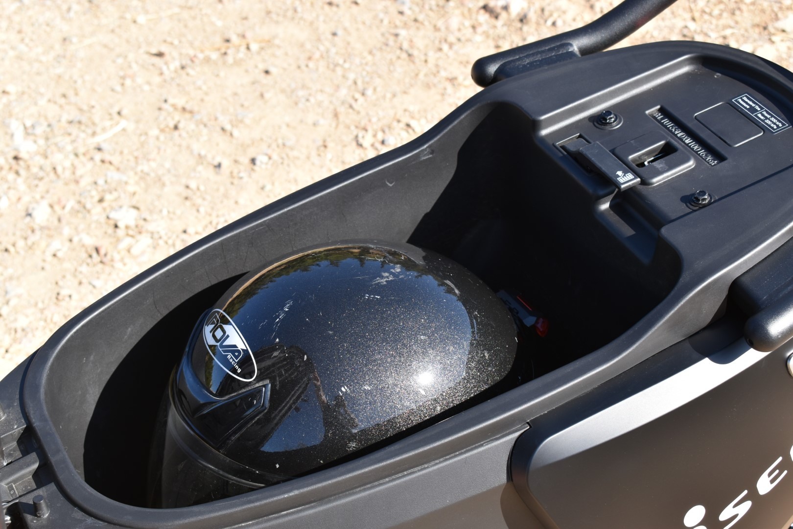Σε ένα σκούτερ είναι σημαντικοί οι αποθηκευτικοί χώροι, ειδικά για το κράνος σας. Ευτυχώς, το Segway E110SE έχει 27 λίτρα χώρου κάτω από τη σέλα και χωράει πολύ άνετα ένα full-face κράνος, συν μερικά αντικείμενα ακόμα. Επιπλέον, υπάρχει ένας μικρός, ανοιχτός αποθηκευτικός χώρος, μπροστά από το αριστερό σας γόνατο. Χωράει μικροαντικείμενα όπως τα κλειδιά, το κινητό σας ή ένα μπουκαλάκι νερό. Είναι αρκετά βαθύς οπότε δύσκολα θα… αναπηδήσει κάποιο αντικείμενο σε λακκούβα, ώστε να πέσει από το μηχανάκι. Τέλος, υπάρχει και ένας μικρός, ενσωματωμένος γάντζος στο κέντρο, για να κρεμάτε σακούλες κ.λπ. Να σημειωθεί πως μέσα στον μικρό αποθηκευτικό χώρο “κρύβεται” και μια θύρα USB με καπάκι. Έτσι, μπορείτε να φορτίζετε το κινητό σας ενώ οδηγείτε, για παράδειγμα.