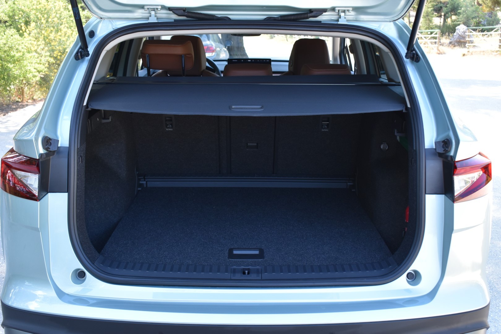 Τα υλικά στο εσωτερικό είναι ποιοτικά και επιλογές σε trims υπάρχουν πολλές. Όλα, πάντως, είναι οικολογικά και με βάση τον παράγοντα της “βιωσιμότητας” του οχήματος. Ακόμα και η καφέ, δερμάτινη επένδυση του Enyaq που είχαμε στα χέρια μας είναι οικολογική και έχει αποκτήσει το χρώμα της με φυτικά έλαια. Ο χώρος αποσκευών είναι αρκετά μεγάλος (585-1.710 Lt), όπως και ο χώρος για εμπρός και πίσω επιβάτες. Πολλοί μικροχώροι για αντικείμενα υπάρχουν μέσα στο όχημα, όπως και δυνατότητα ενσύρματης/ασύρματης φόρτισης του κινητού σας. Τέλος, ο κρυφός φωτισμός στα πόδια των επιβατών αλλά και ο ambient φωτισμός κατά μήκος του ταμπλώ και των πορτών είναι εντυπωσιακός αλλά και ουσιαστικός, σε σκοτεινό περιβάλλον.