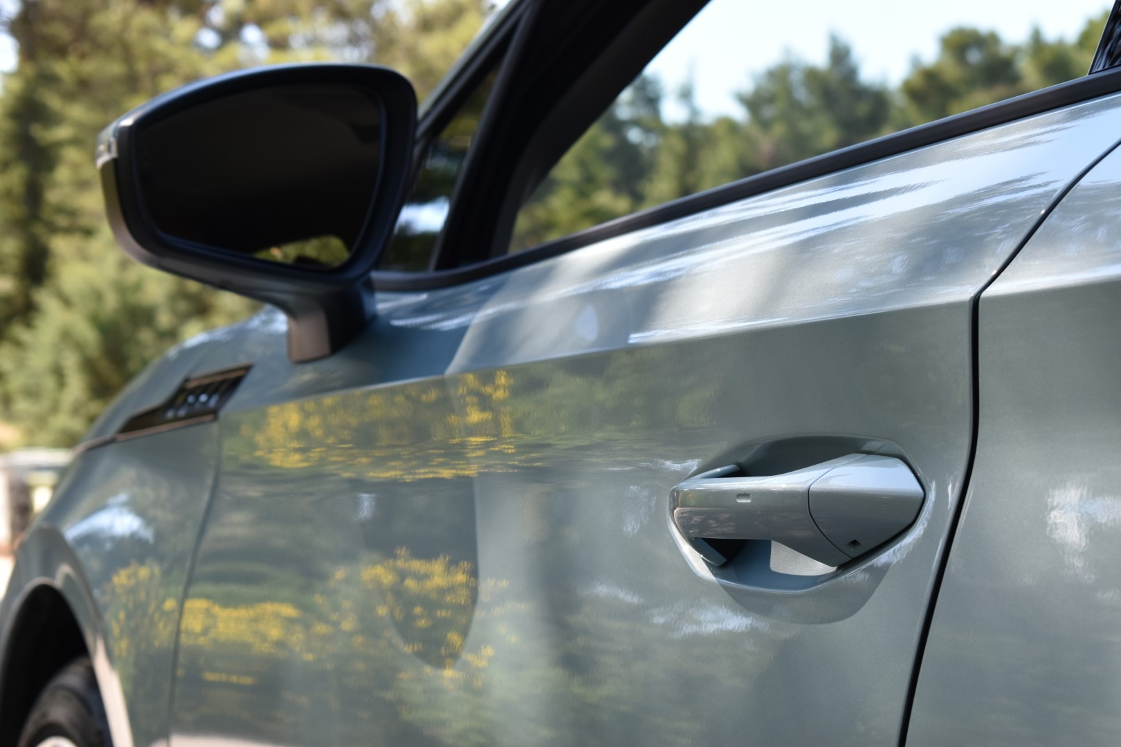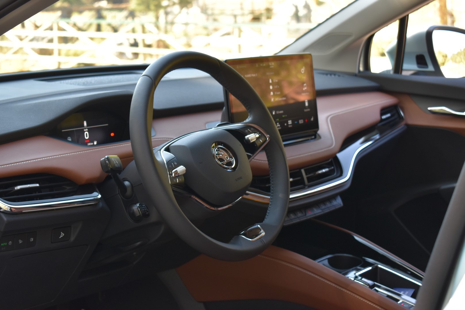 Το κιβώτιο είναι μιας σχέσης αλλά στο τιμόνι θα βρείτε paddles! Ο λόγος είναι απλός. Στο B mode κίνησης έχετε τη μέγιστη δυνατή ανάκτηση ενέργειας. Στο D mode έχετε 3 διαφορετικά επίπεδα ανάκτησης, τα οποία επιλέγετε γρήγορα μέσω των paddles, π.χ. πλησιάζοντας σε ένα κόκκινο φανάρι ή ξεκινώντας μια κατηφόρα. Έτσι, αν δεν θέλετε να κινείστε διαρκώς στο B mode, το D επιτρέπει το “override” της default ρύθμισης μέσω των paddles. Μόλις πατήσετε ξανά το γκάζι, επιστρέφει στo ελάχιστο επίπεδο regenerative braking αυτόματα. Ο επιλογέας ταχυτήτων δεν είναι πίσω από το τιμόνι, δεξιά τoυ dashboard, όπως στο ID.4, αλλά στο γνώριμο σημείο, ανάμεσα σε οδηγό και συνοδηγό. Είναι μικρός και διακριτικός, όμως, με τη μορφή μεγάλου “διακόπτη”. Άλλη μια απόδειξη του οτι η Skoda ακολούθησε μια διαφορετική προσέγγιση στο Enyaq.