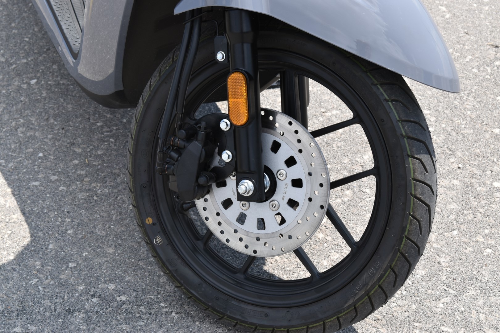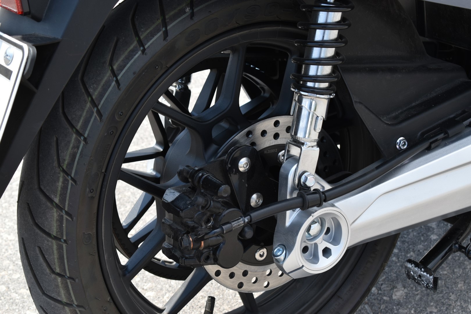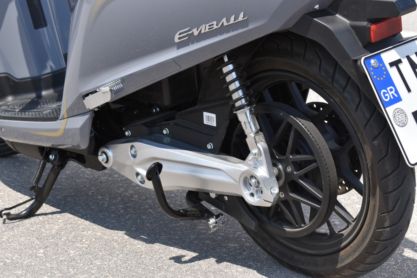 Αφού μιλήσαμε για την ηλεκτροκίνηση, πάμε και στα συμβατικά εξαρτήματα. Το e-Viball 125 “πατάει” σε τροχούς 14″ με λάστιχα της CST, τα οποία αποδείχθηκαν αρκετά καλά σε πρόσφυση, σε στεγνό και βρεγμένο, τουλάχιστον όσον είναι φρέσκα. Συγκεκριμένα, είναι 80/90-14 εμπρός και 90/90-14 πίσω. Μπροστά έχουμε τηλεσκοπικό πιρούνι με διαδρομή 90mm, το οποίο μερικές φορές αισθανθήκαμε να “κοπανάει”. Πίσω έχουμε διπλή ανάρτηση με διαδρομή 71mm και δυνατότητα ρύθμισης προφόρτισης. Πρόκειται για “βασικά” συστήματα αναρτήσεων που θα σας βοηθήσουν να περνάτε τις λακκούβες σχετικά ξεκούραστα.