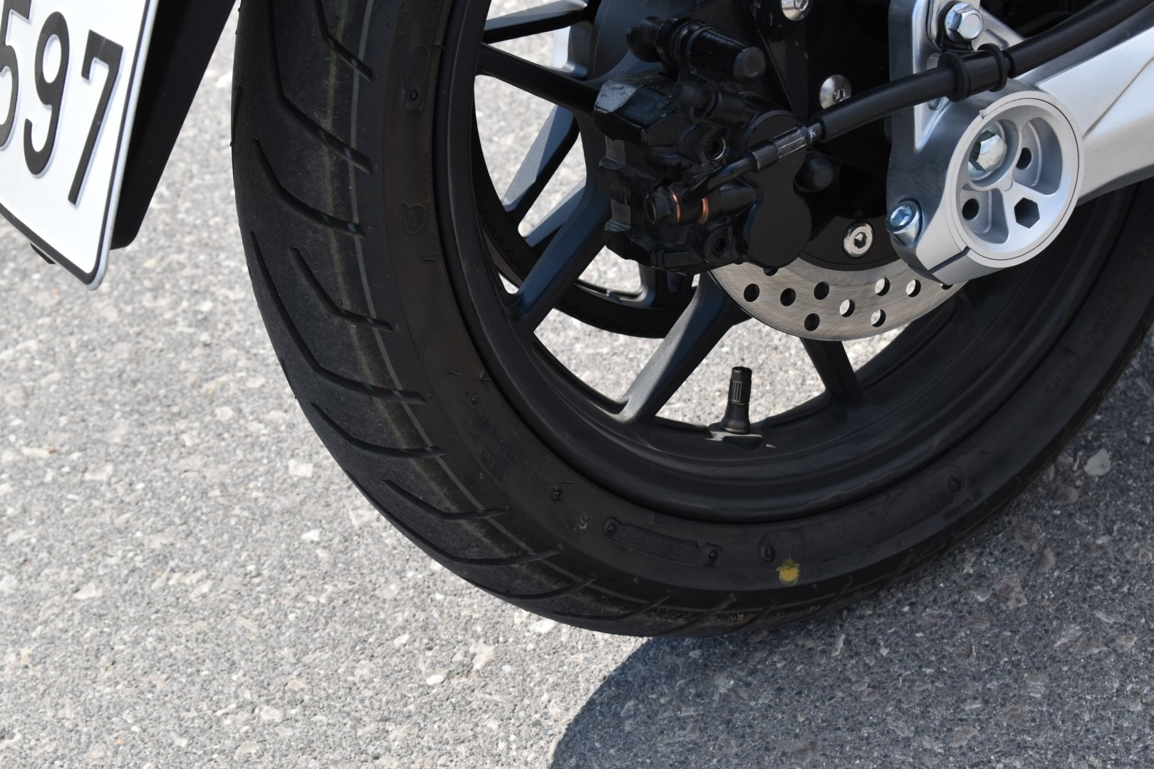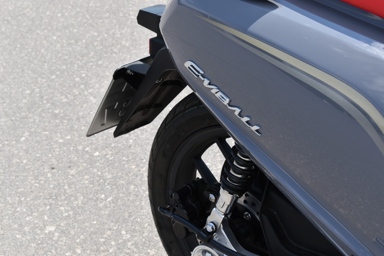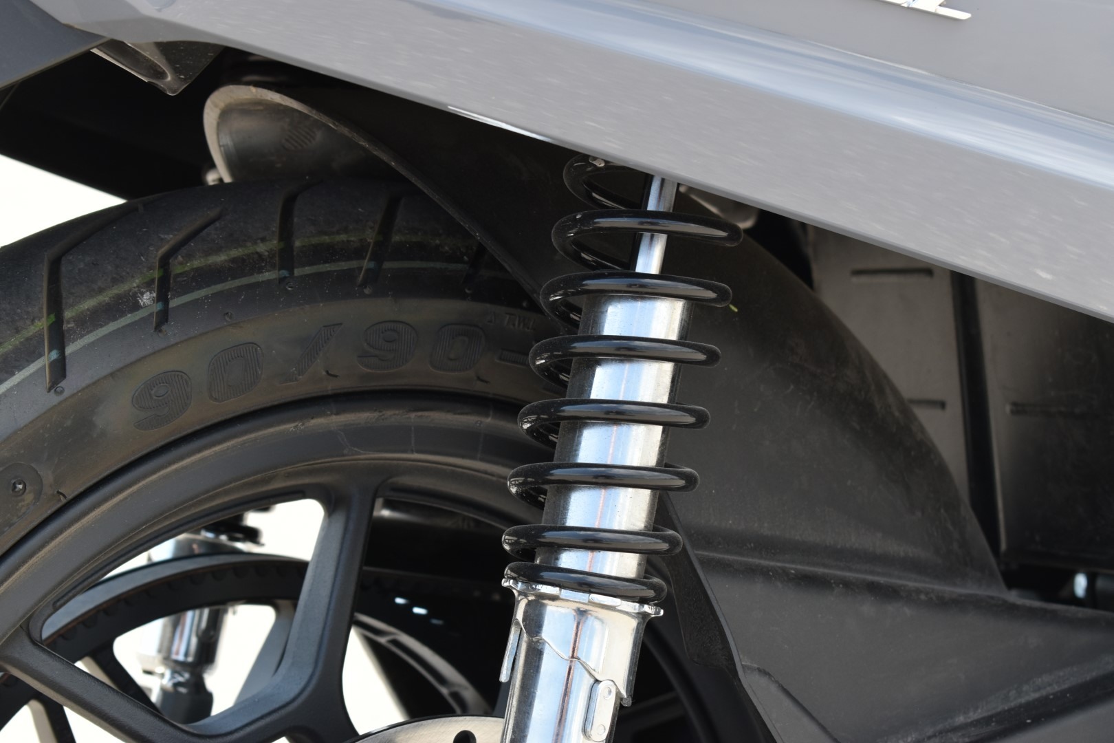 Αφού μιλήσαμε για την ηλεκτροκίνηση, πάμε και στα συμβατικά εξαρτήματα. Το e-Viball 125 “πατάει” σε τροχούς 14″ με λάστιχα της CST, τα οποία αποδείχθηκαν αρκετά καλά σε πρόσφυση, σε στεγνό και βρεγμένο, τουλάχιστον όσον είναι φρέσκα. Συγκεκριμένα, είναι 80/90-14 εμπρός και 90/90-14 πίσω. Μπροστά έχουμε τηλεσκοπικό πιρούνι με διαδρομή 90mm, το οποίο μερικές φορές αισθανθήκαμε να “κοπανάει”. Πίσω έχουμε διπλή ανάρτηση με διαδρομή 71mm και δυνατότητα ρύθμισης προφόρτισης. Πρόκειται για “βασικά” συστήματα αναρτήσεων που θα σας βοηθήσουν να περνάτε τις λακκούβες σχετικά ξεκούραστα.