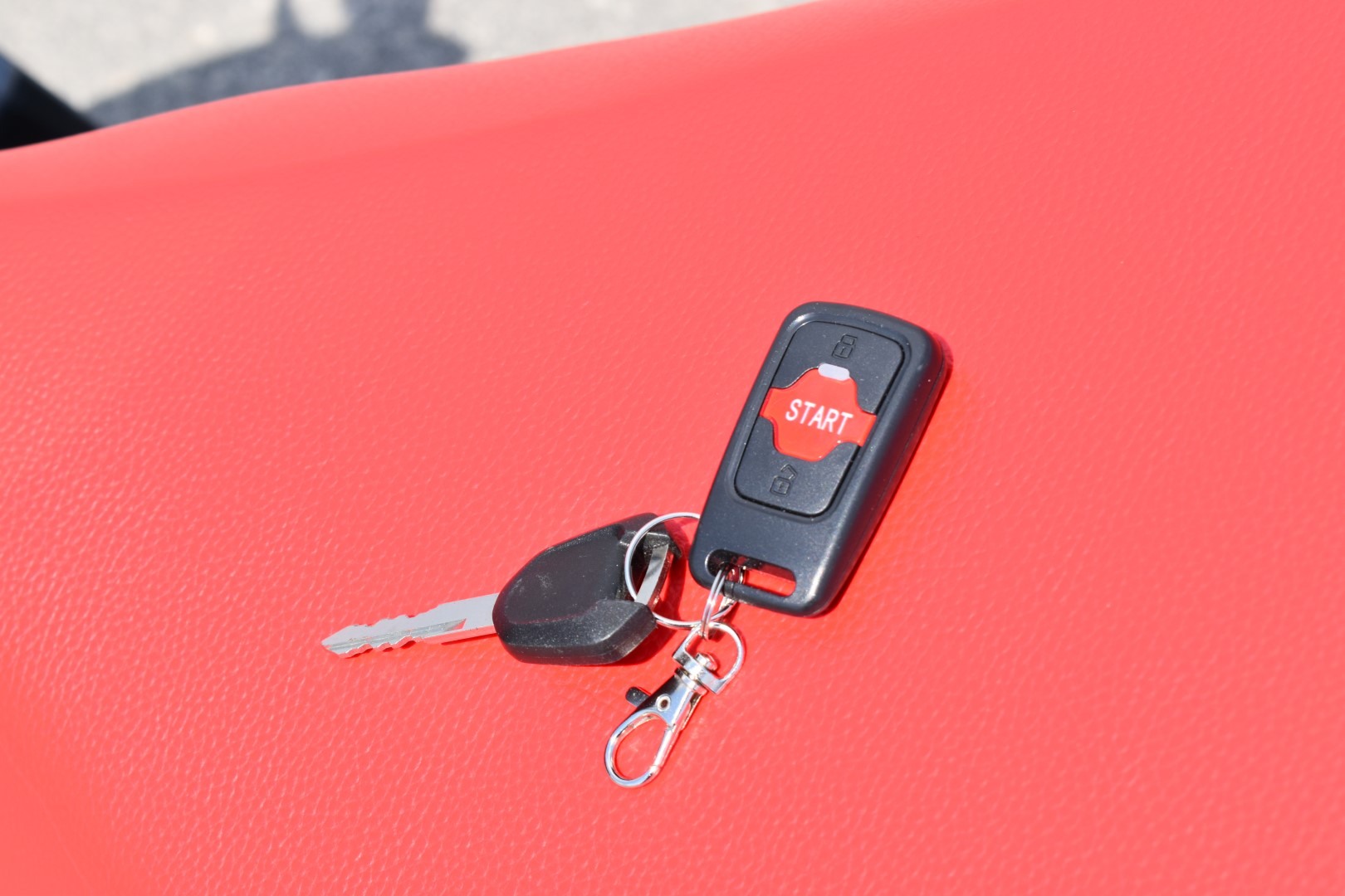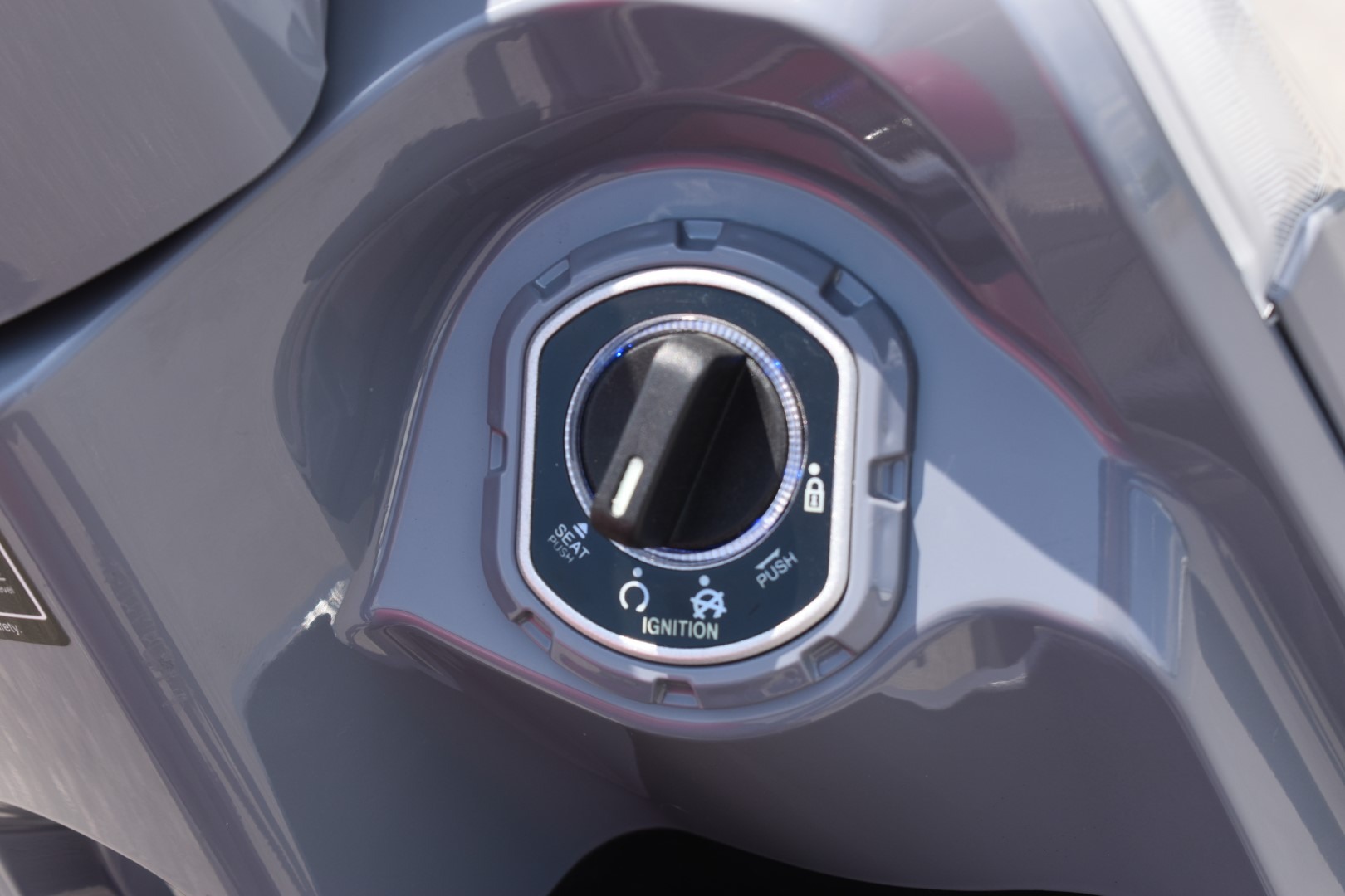 Όταν πλησιάσετε σε απόσταση 1,5m από το σκούτερ, το keyfob αναγνωρίζεται αυτόματα. Έπειτα, μπορείτε να χρησιμοποιήσετε τον περιστροφικό διακόπτη για να ξεκλειδώσετε το τιμόνι, να “βάλετε μπροστά” ή να ξεκλειδώσετε τη σέλα. Αντίστοιχα, τον γυρνάτε στη θέση κλειδώματος και φεύγετε, χωρίς να πατήσετε το κουμπί στο remote. Πραγματικά ένα από τα χαρακτηριστικά που απολαύσαμε περισσότερο στο σκούτερ. Αν προσπαθήσει κάποιος να κάνει τα παραπάνω χωρίς το remote, θα ενεργοποιηθεί ο συναγερμός, ο οποίος είναι και κραδασμικός.