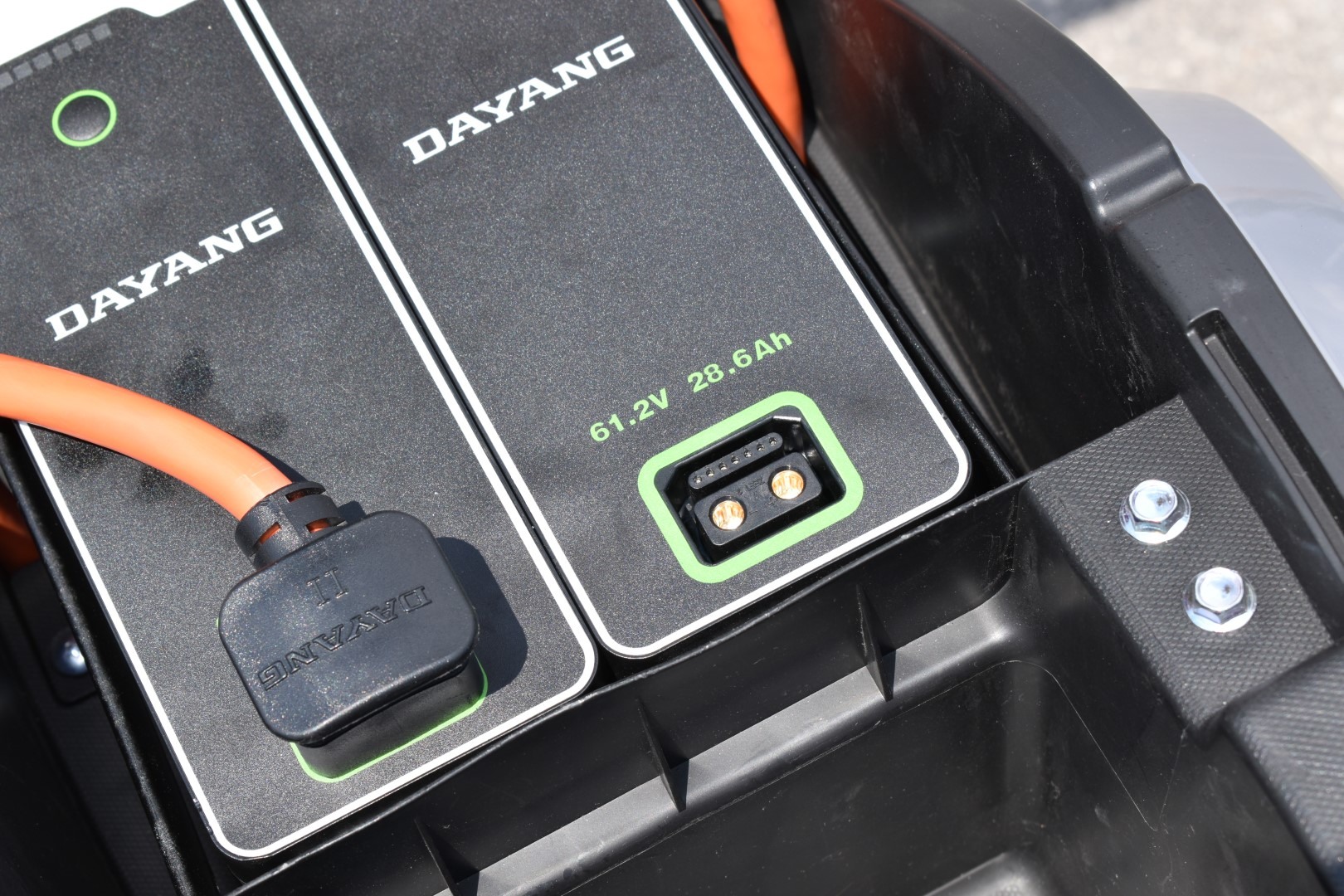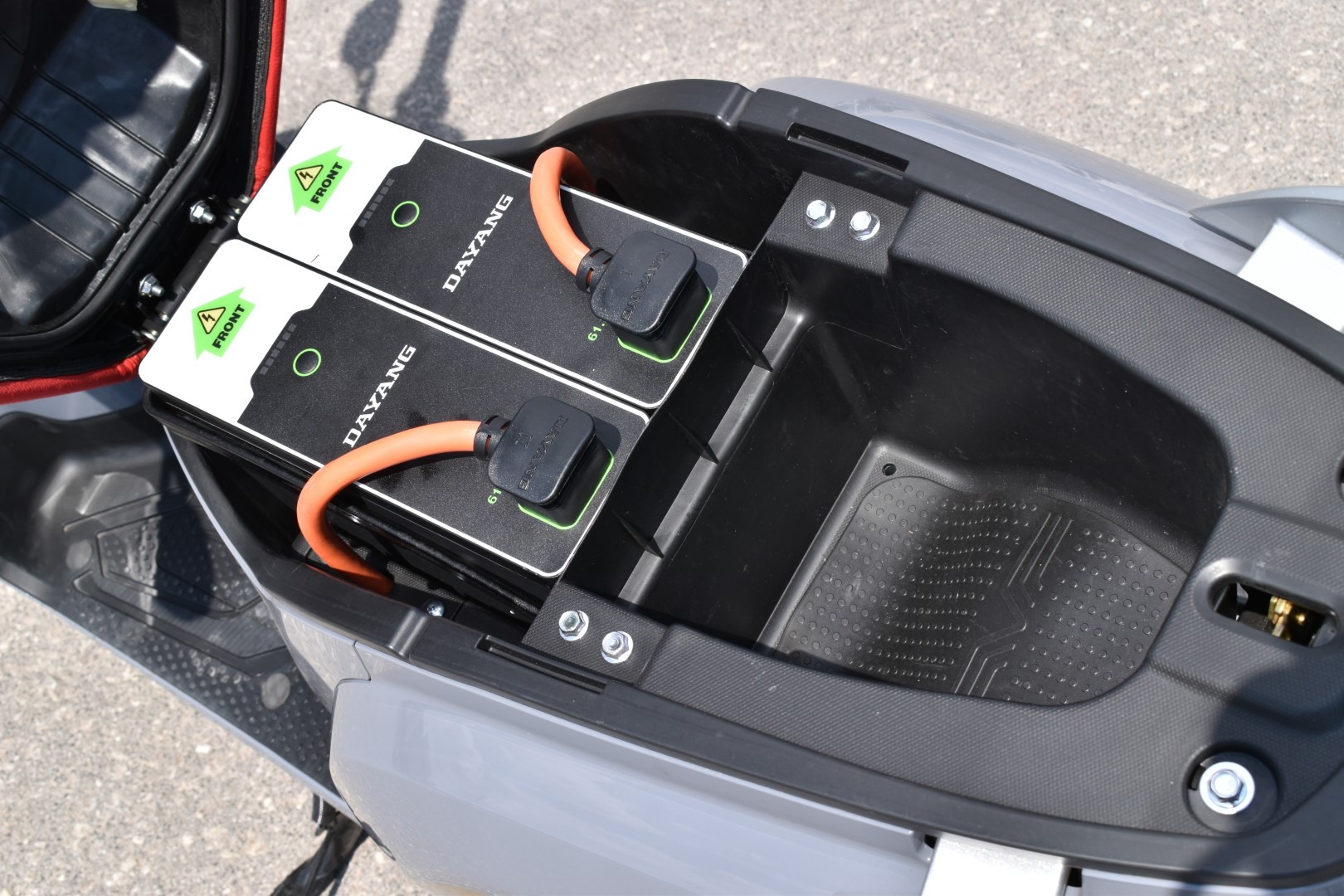 Το άλλο χαρακτηριστικό που είναι σημαντικό σε ένα ηλεκτρικό, είναι η αυτονομία του. Κάτω από τη σέλα του e-Viball 125 βρίσκονται δύο μπαταρίες των 61,2V. Έχουν χωρητικότητα 28,6Ah έκαστη, δίνοντας ένα σύνολο 57,2Ah. Ζυγίζουν 12 Kg έκαστη οπότε αποτελούν το 20% του βάρους του σκούτερ. Είναι αφαιρούμενες απλώς βγάζοντας το φις τους και σηκώνοντάς τες μέσω του πλαστικού χερουλιού. Έτσι, μπορείτε να τις πάρετε μαζί σας για φόρτιση στο σπίτι, στο γραφείο, οπουδήποτε θέλετε. Βέβαια, μπορείτε να τις επαναφορτίσετε και πάνω στο σκούτερ, με την υποδοχή φόρτισης να βρίσκεται στα πόδια του αναβάτη. Επίσης, μπορείτε να πάρετε μαζί σας για φόρτιση μόνο την μια, αφήνοντας την άλλη να τροφοδοτεί το σκούτερ ή αν θέλετε να το χρησιμοποιήσετε εν τω μεταξύ.