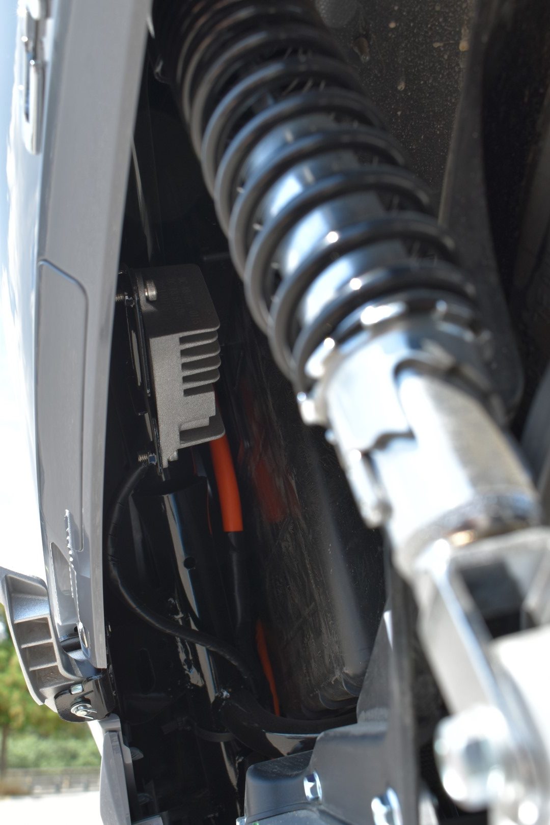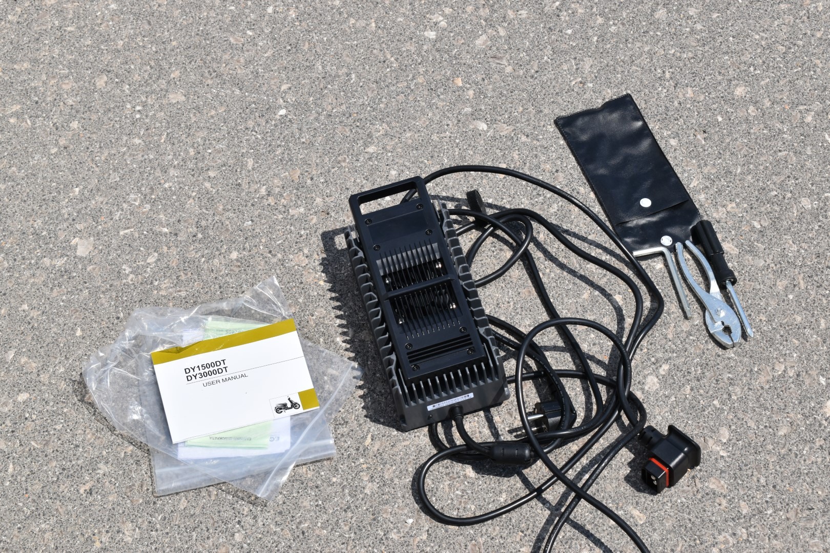 Ο φορτιστής χωράει ίσα-ίσα κάτω από τη σέλα, είναι ογκώδης, με παθητική αλλά και ενεργητική ψύξη (ανεμιστηράκι). Μπορεί να φορτίζει μόνο μια μπαταρία ανά πάσα στιγμή, ενώ κάθε τόσο ενεργοποιείται το ανεμιστηράκι του, οπότε σίγουρα δεν είναι αθόρυβος. Τον “μετρήσαμε” στα 540W (peak) περίπου, ενώ θέλει 3,5-4 ώρες για να φορτίσει πλήρως τη μια μπαταρία. Όσο για την κατανάλωση, μετρήσαμε περίπου 1,8kWh για την κάθε μπαταρία, σύνολο 3,6kWh, χωρίς όμως να τις έχουμε αδειάσει τελείως.