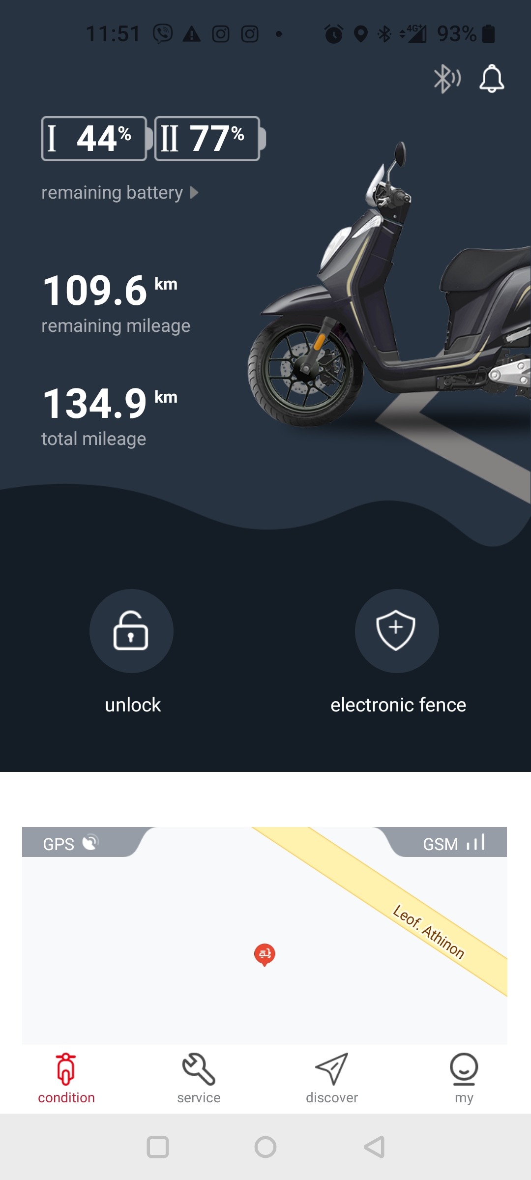 Τέλος, το σύστημα εντοπισμού του σκούτερ μέσω GPS. Ένας δέκτης GPS μαζί με κάρτα SIM (δεδομένων) εξασφαλίζουν τη συνδεσιμότητά του, αρκεί να βρίσκεται σε περιοχή κάλυψης. Πρέπει να εγκαταστήσετε στο κινητό σας το σχετικό app και στη συνέχεια θα “βλέπετε” το σκούτερ σας στο χάρτη ανά πάσα στιγμή, αλλά και γενικά θα μπορείτε να το “διαχειρίζεστε” πιο εύκολα.