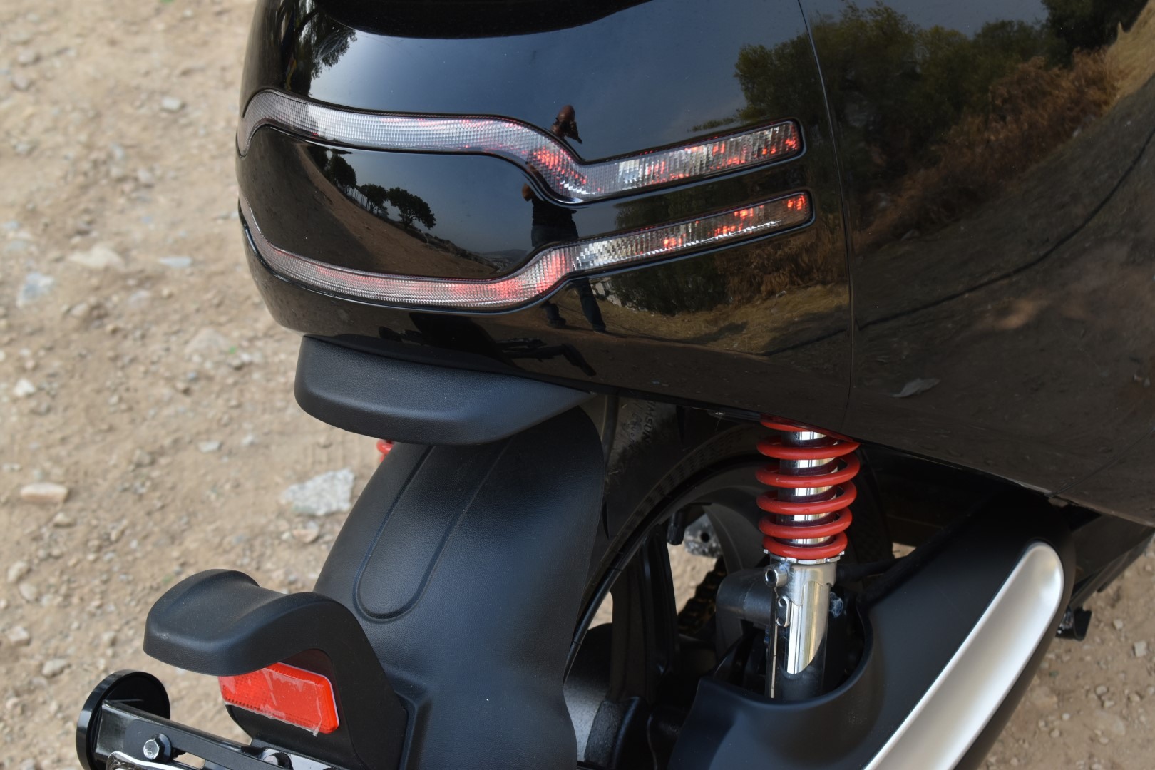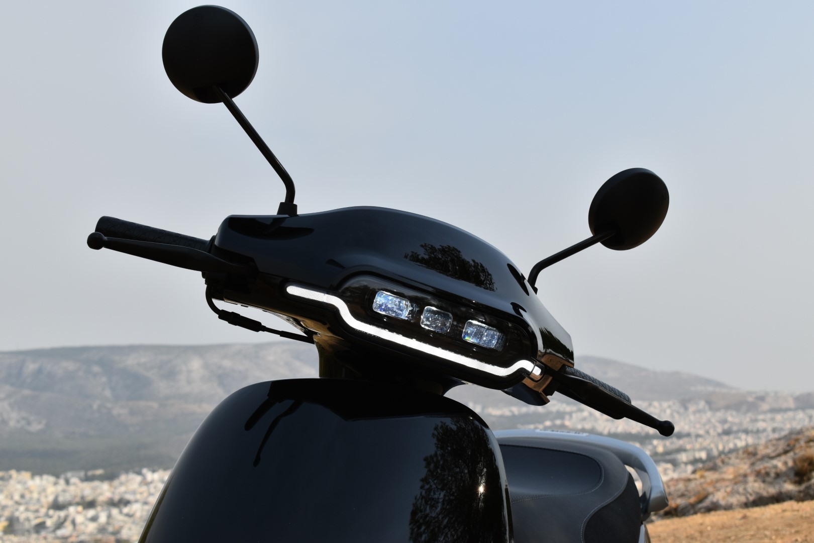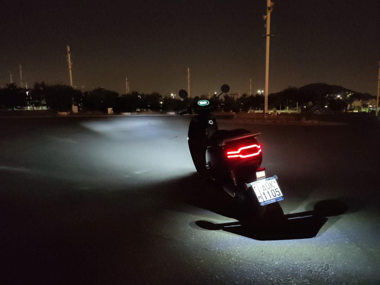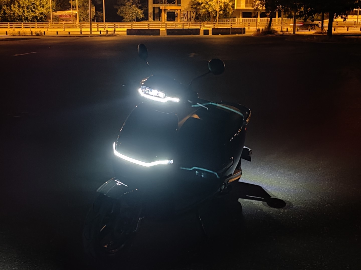 Τα φώτα, όπως προείπαμε, είναι LED εμπρός και πίσω. Στο εμπρός μέρος έχουμε τρια μικρά projectors, πάνω στο τιμόνι. Το ένα είναι η μικρή σκάλα και τα άλλα δύο είναι η μεγάλη, που φωτίζει κεντρικά και μακριά. Από πλευράς απόδοσης και φωτισμού είναι ικανοποιητικά εντός πόλης, αλλά εκτός, σε εντελώς σκοτεινούς δρόμους, θα θέλαμε μια πιο “γεμάτη” δέσμη και μεγαλύτερη ισχύ. Το θετικό είναι πως “κοιτάζουν” όπου και το τιμόνι, κάτι που βοηθάει την ορατότητα στις στροφές. Από το πίσω φως μείναμε ικανοποιημένοι, ενώ έχει αρκετά ιδιαίτερο, εντυπωσιακό σχεδιασμό. Τα φλας/αλάρμ είναι επίσης LED και ικανοποιητικά.