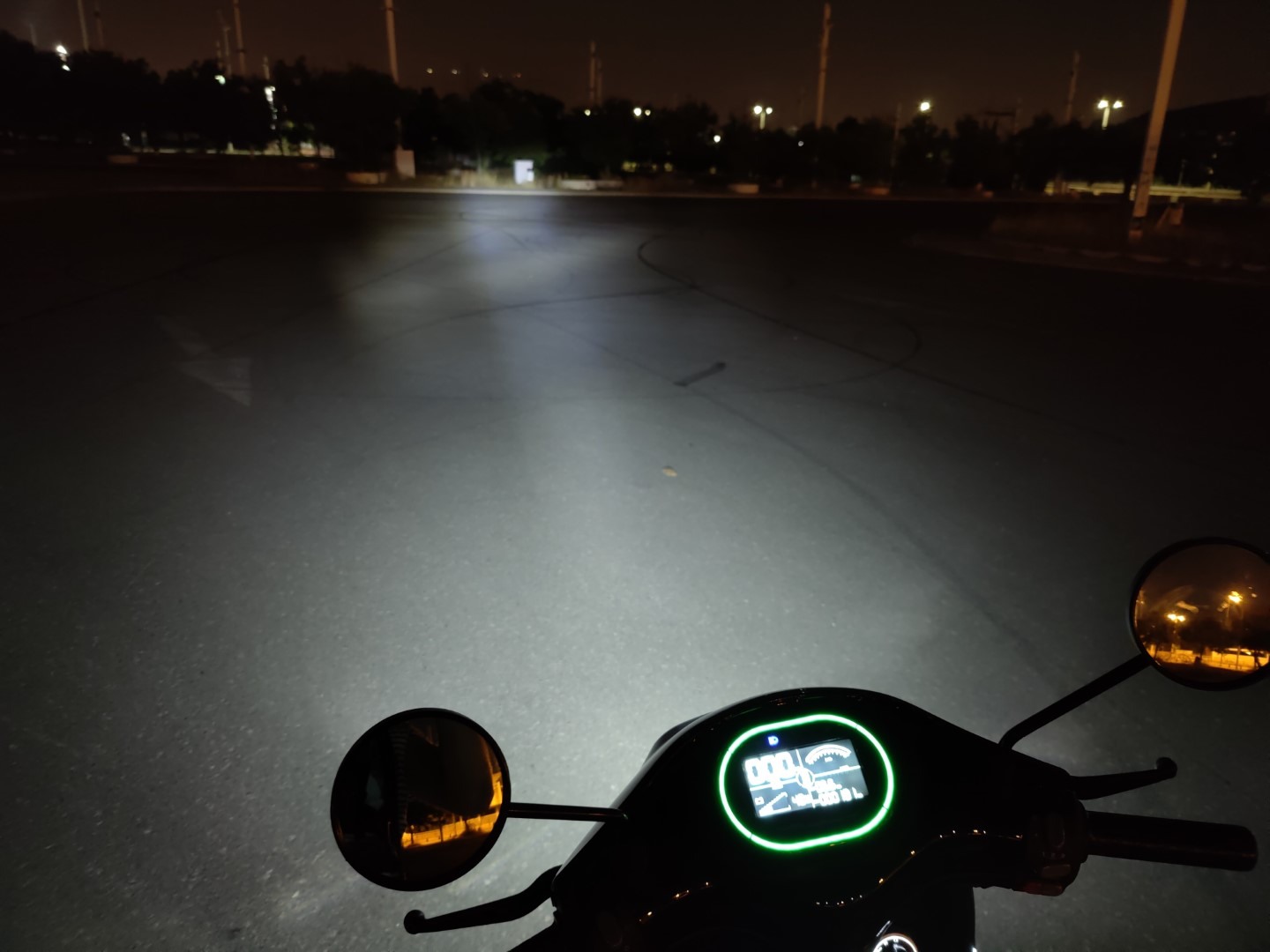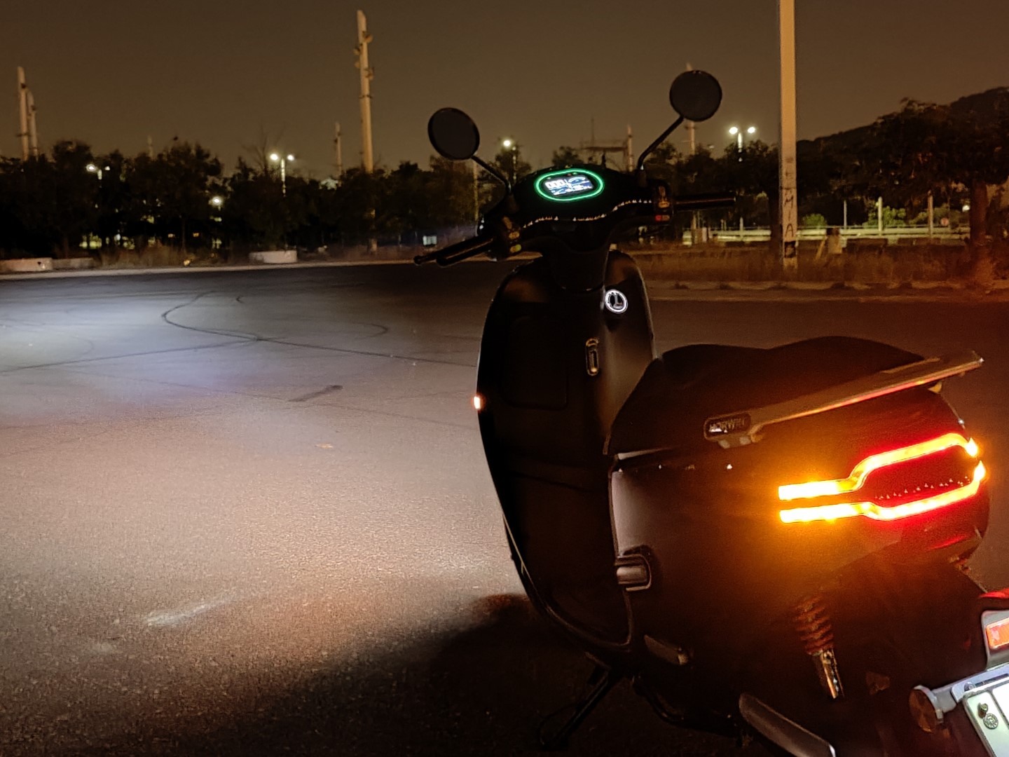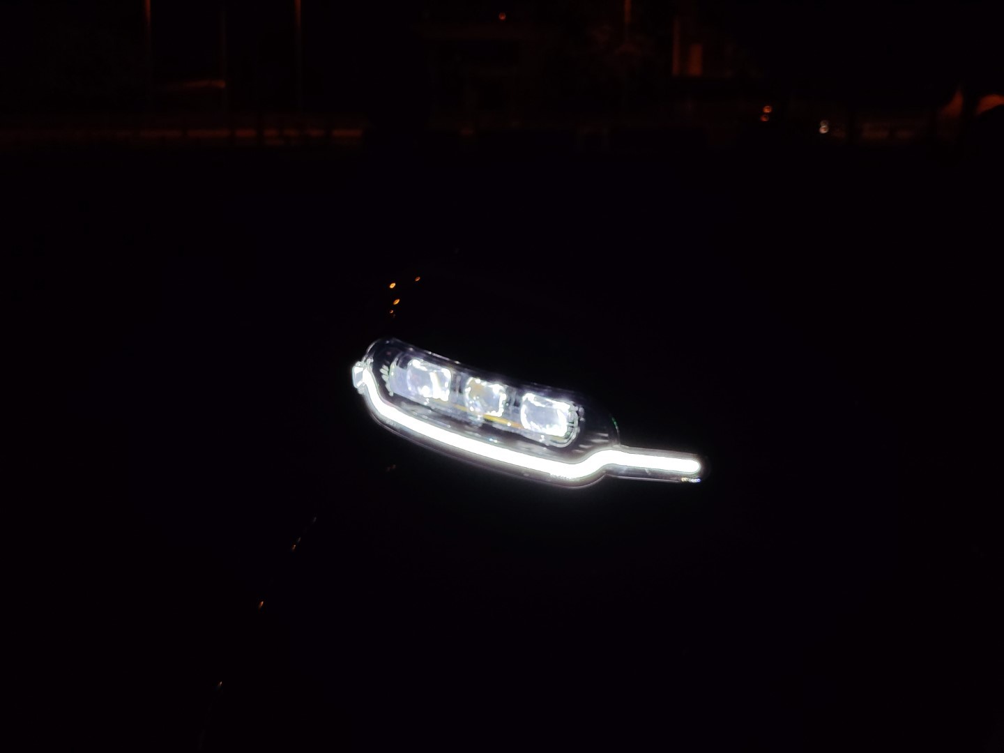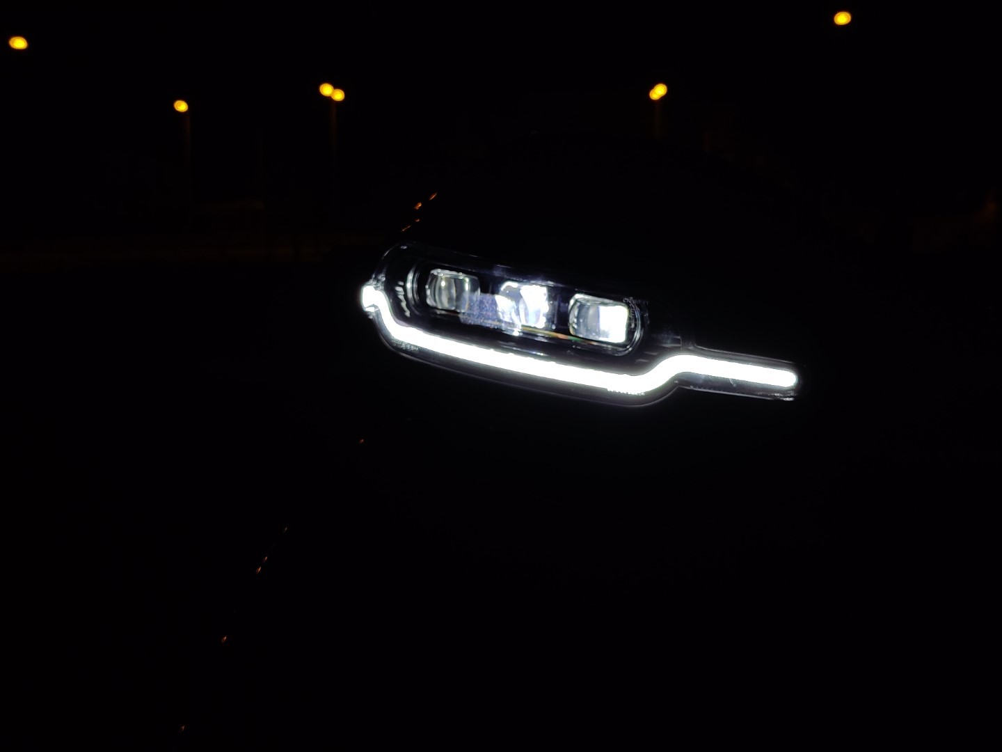 Τα φώτα, όπως προείπαμε, είναι LED εμπρός και πίσω. Στο εμπρός μέρος έχουμε τρια μικρά projectors, πάνω στο τιμόνι. Το ένα είναι η μικρή σκάλα και τα άλλα δύο είναι η μεγάλη, που φωτίζει κεντρικά και μακριά. Από πλευράς απόδοσης και φωτισμού είναι ικανοποιητικά εντός πόλης, αλλά εκτός, σε εντελώς σκοτεινούς δρόμους, θα θέλαμε μια πιο “γεμάτη” δέσμη και μεγαλύτερη ισχύ. Το θετικό είναι πως “κοιτάζουν” όπου και το τιμόνι, κάτι που βοηθάει την ορατότητα στις στροφές. Από το πίσω φως μείναμε ικανοποιημένοι, ενώ έχει αρκετά ιδιαίτερο, εντυπωσιακό σχεδιασμό. Τα φλας/αλάρμ είναι επίσης LED και ικανοποιητικά.