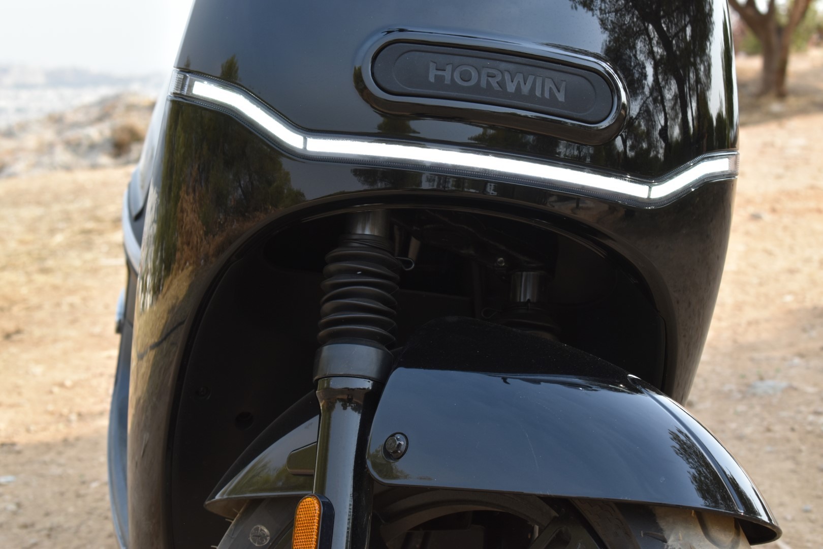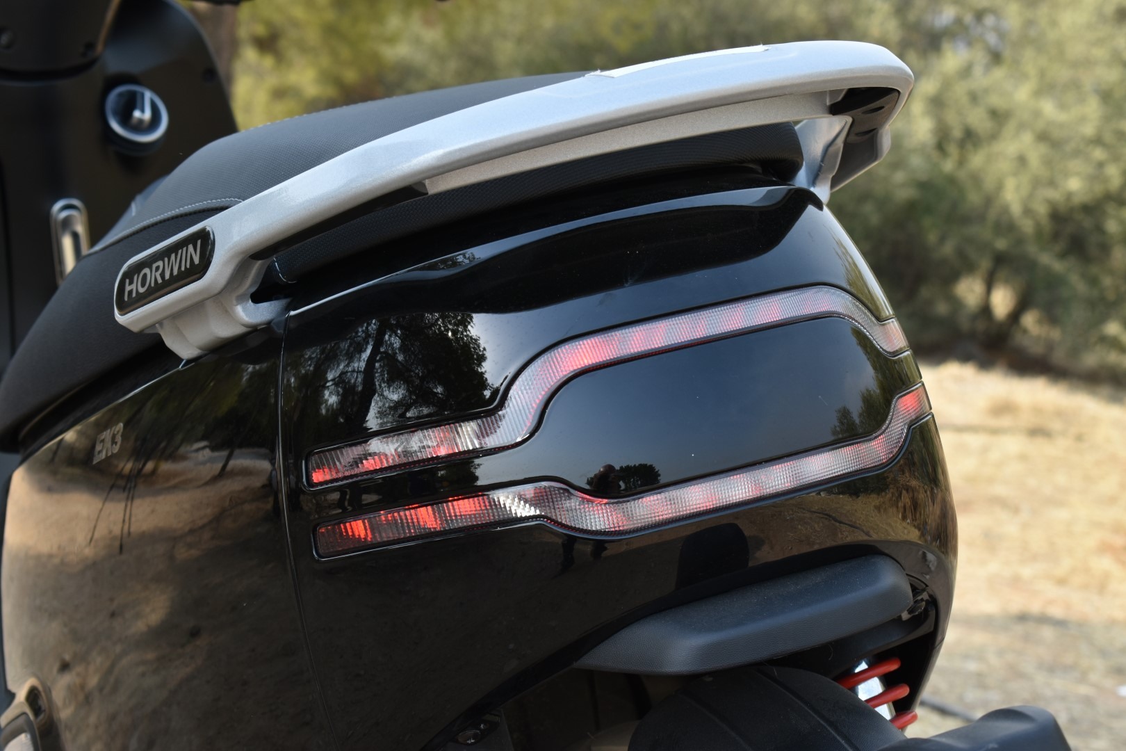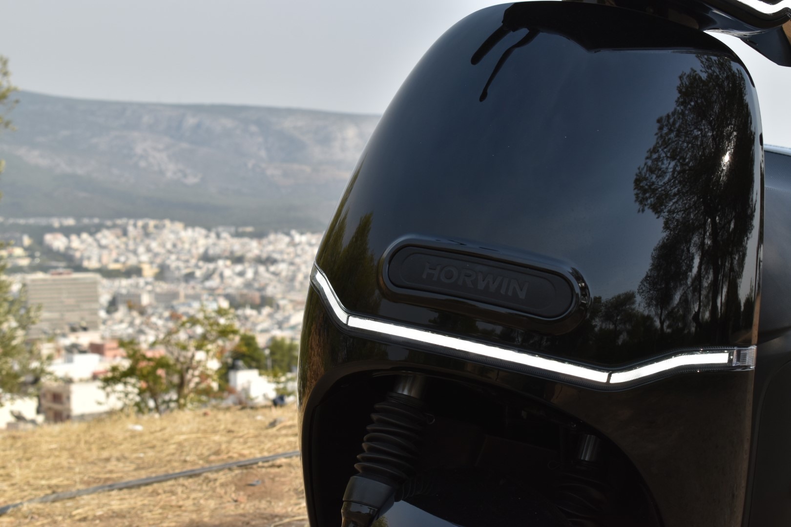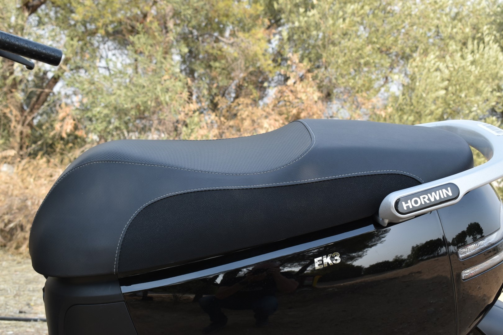 Το είχαμε στη διάθεσή μας σε μαύρο χρώμα με glossy φινίρισμα, ενώ θα το βρείτε και σε άλλα χρώματα. Επίσης, υπάρχει και το Horwin EK3 Deluxe, το έρχεται με μεταλλικό φινίρισμα και διχρωμία. Συν, την διαφορετικού χρώματος σέλα, που είναι ίδια (ως υλικό) με του απλού μοντέλου. Εμφανισιακά, είναι μάλλον διακριτικό και όχι “κραυγαλέο”. Ωστόσο, παίρνει αρκετούς πόντους το βράδυ, χάρη στα LED φώτα του, εμπρός και πίσω. Το σχέδιό τους, σε συνδυασμό με τα DRLs, το κάνουν να ξεχωρίζει αμέσως.