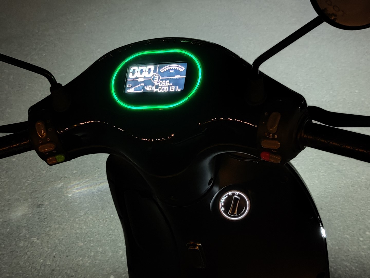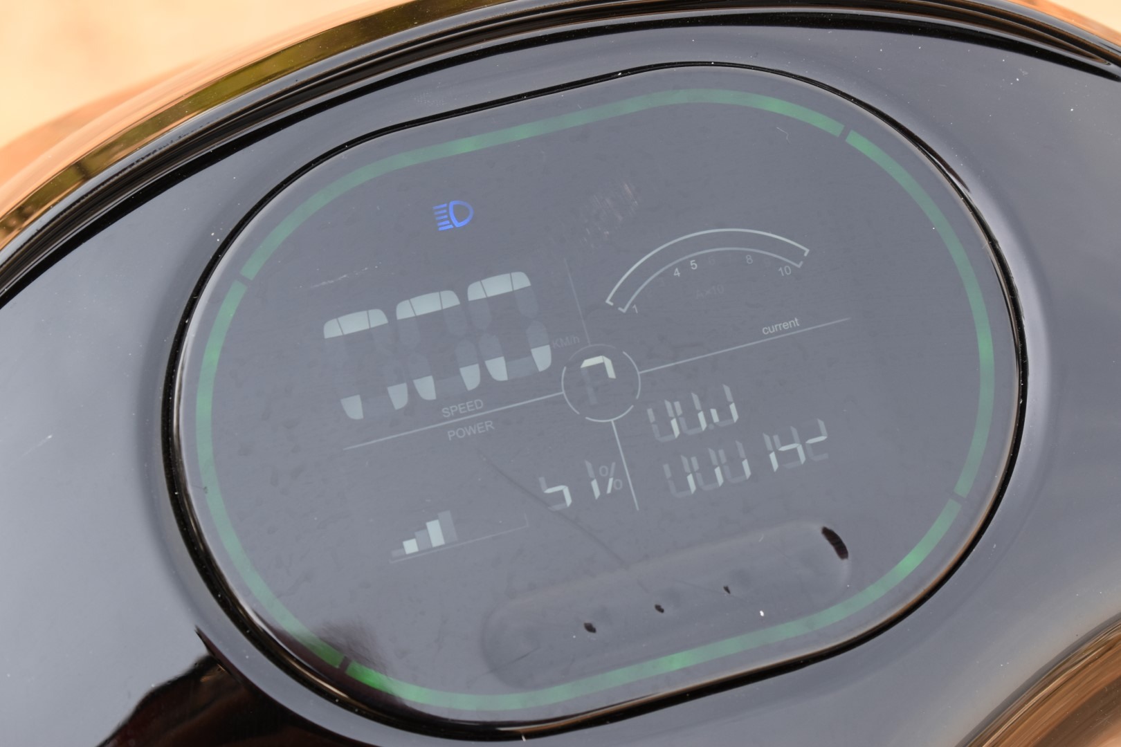 Η κεντρική οθόνη είναι έγχρωμη με μαύρο φόντο και λευκές ενδείξεις. Ευκρινέστατη χωρίς να κουράζει το βράδυ, αντανακλά αρκετά το φως στον ήλιο, οπότε γίνεται κάπως δυσδιάκριτη την ημέρα (όχι στην σκιά). παρά το “φιμέ” πλαστικό που την καλύπτει. Σας δείχνει τη μπαταρία, την ταχύτητα, το trip, το οδόμετρο αλλά και το πόσα A “τραβάει” το μοτέρ ανά πάσα στιγμή, με σκαλοπάτια των 10Α (10-100Α). Δείτε το σαν ένα είδος “μετρητή οικονομίας”, αν θέλετε. Τέλος, ένα “δαχτυλίδι” περιμετρικά της οθόνης φωτίζεται ανάλογα με την ταχύτητά σας. Πράσινο μέχρι τα 45 Km/h, έπειτα μπλε, στη συνέχεια κίτρινο και πάνω από τα 75 Km/h γίνεται κόκκινο. Έτσι, ξέρετε περίπου πόσο γρήγορα πηγαίνετε το βράδυ, χωρίς να κοιτάτε την οθόνη, με την περιφερειακή σας όραση.