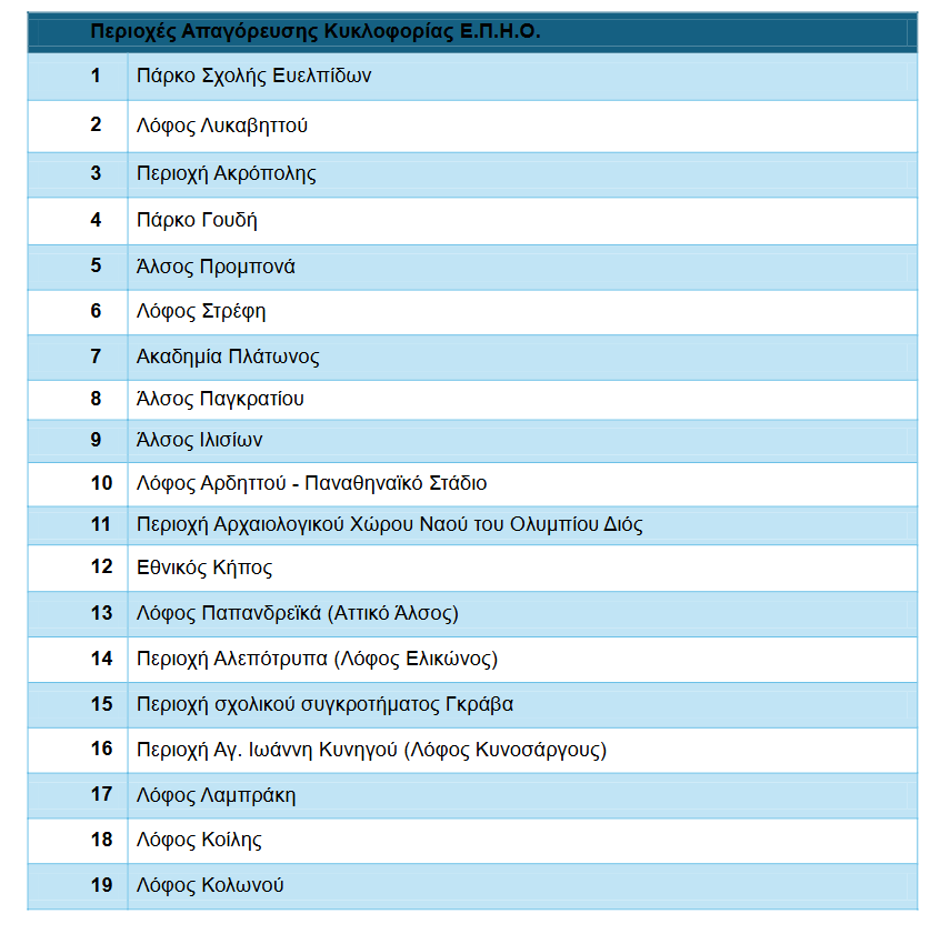 - Πλήρης απαγόρευση κυκλοφορίας και στάθμευσης σε όλη την περιοχή γύρω από την Ακρόπολη στο ιστορικό κέντρο, σε άλση, καθώς και στους πεζόδρομους Ερμού και Αιόλου.
