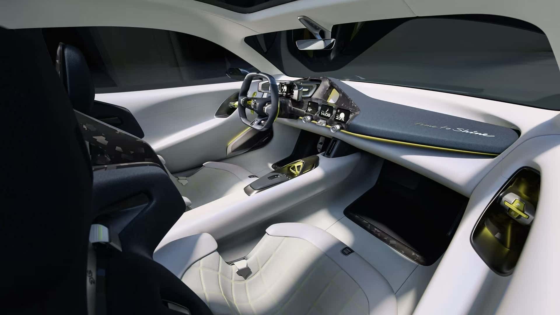 Το πιο εντυπωσιακό στοιχείο στο εσωτερικό είναι ένα κουμπί «Spark Yellow Plus» στην κεντρική κονσόλα. Όταν ενεργοποιηθεί, συμβαίνει μια φυσική μεταμόρφωση: η ανάρτηση χαμηλώνει κατά 15 χιλιοστά, τα αεροδυναμικά στοιχεία εμπρός και πίσω προεκτείνονται κατά 100 χιλιοστά και μια κρυφή πίσω αεροτομή ανασηκώνεται για να αυξήσει την κάθετη δύναμη. Ταυτόχρονα, ο πίνακας οργάνων και οι τρεις μικρότερες κεντρικές οθόνες αναδιπλώνονται και εξαφανίζονται τελείως, σε μια διάταξη που η εταιρεία συγκρίνει με την προσέγγιση της McLaren, με στόχο να εξαλείψει κάθε περιττή απόσπαση προσοχής κατά την οδήγηση σε πίστα.